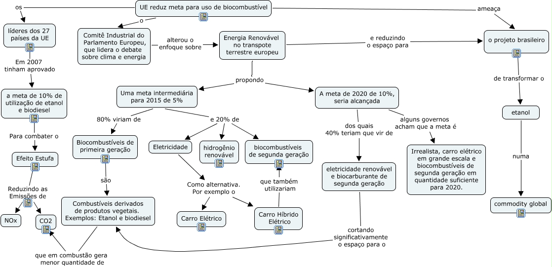 Esse mapa conceitual, produzido no IHMC CmapTools, tem a informação relacionada a: UE reduz meta para uso de biocombustível v3, Eletricidade Como alternativa. Por exemplo o Carro Elétrico, UE reduz meta para uso de biocombustível os líderes dos 27 países da UE, Carro Híbrido Elétrico que também utilizariam biocombustíveis de segunda geração, Efeito Estufa Reduzindo as Emissões de CO2, UE reduz meta para uso de biocombustível ameaça o projeto brasileiro, A meta de 2020 de 10%, seria alcançada alguns governos acham que a meta é Irrealista, carro elétrico em grande escala e biocombustíveis de segunda geração em quantidade suficiente para 2020., Energia Renovável no transpote terrestre europeu propondo Uma meta intermediária para 2015 de 5%, Combustíveis derivados de produtos vegetais. Exemplos: Etanol e biodiesel que em combustão gera menor quantidade de CO2, UE reduz meta para uso de biocombustível o Comitê Industrial do Parlamento Europeu, que lidera o debate sobre clima e energia, Energia Renovável no transpote terrestre europeu e reduzindo o espaço para o projeto brasileiro, Energia Renovável no transpote terrestre europeu propondo A meta de 2020 de 10%, seria alcançada, eletricidade renovável e biocarburante de segunda geração cortando significativamente o espaço para o Combustíveis derivados de produtos vegetais. Exemplos: Etanol e biodiesel, líderes dos 27 países da UE Em 2007 tinham aprovado a meta de 10% de utilização de etanol e biodiesel, Biocombustíveis de primeira geração são Combustíveis derivados de produtos vegetais. Exemplos: Etanol e biodiesel, Uma meta intermediária para 2015 de 5% e 20% de biocombustíveis de segunda geração, Eletricidade Como alternativa. Por exemplo o Carro Híbrido Elétrico, Efeito Estufa Reduzindo as Emissões de NOx, Comitê Industrial do Parlamento Europeu, que lidera o debate sobre clima e energia alterou o enfoque sobre Energia Renovável no transpote terrestre europeu, a meta de 10% de utilização de etanol e biodiesel Para combater o Efeito Estufa, Uma meta intermediária para 2015 de 5% e 20% de hidrogênio renovável