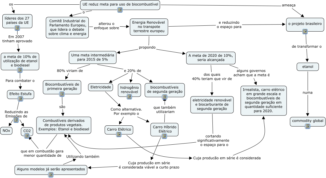 Esse mapa conceitual, produzido no IHMC CmapTools, tem a informação relacionada a: UE reduz meta para uso de biocombustível v4, Alguns modelos já serão apresentados Utilizando também Combustíveis derivados de produtos vegetais. Exemplos: Etanol e biodiesel, UE reduz meta para uso de biocombustível os líderes dos 27 países da UE, Eletricidade Como alternativa. Por exemplo o Carro Elétrico, Carro Elétrico Cuja producão em série é considerada Irrealista, carro elétrico em grande escala e biocombustíveis de segunda geração em quantidade suficiente para 2020., Efeito Estufa Reduzindo as Emissões de CO2, Carro Híbrido Elétrico que também utilizariam biocombustíveis de segunda geração, A meta de 2020 de 10%, seria alcançada alguns governos acham que a meta é Irrealista, carro elétrico em grande escala e biocombustíveis de segunda geração em quantidade suficiente para 2020., UE reduz meta para uso de biocombustível ameaça o projeto brasileiro, Combustíveis derivados de produtos vegetais. Exemplos: Etanol e biodiesel que em combustão gera menor quantidade de CO2, Energia Renovável no transpote terrestre europeu propondo Uma meta intermediária para 2015 de 5%, UE reduz meta para uso de biocombustível o Comitê Industrial do Parlamento Europeu, que lidera o debate sobre clima e energia, Energia Renovável no transpote terrestre europeu e reduzindo o espaço para o projeto brasileiro, eletricidade renovável e biocarburante de segunda geração cortando significativamente o espaço para o Combustíveis derivados de produtos vegetais. Exemplos: Etanol e biodiesel, Energia Renovável no transpote terrestre europeu propondo A meta de 2020 de 10%, seria alcançada, Biocombustíveis de primeira geração são Combustíveis derivados de produtos vegetais. Exemplos: Etanol e biodiesel, líderes dos 27 países da UE Em 2007 tinham aprovado a meta de 10% de utilização de etanol e biodiesel, Uma meta intermediária para 2015 de 5% e 20% de biocombustíveis de segunda geração, Eletricidade Como alternativa. Por exemplo o Carro Híbrido Elétrico, Efeito Estufa Reduzindo as Emissões de NOx, Uma meta intermediária para 2015 de 5% e 20% de hidrogênio renovável