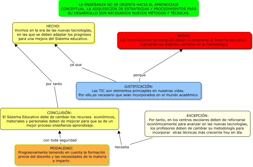 Este Cmap, tiene información relacionada con: Hilo Rol y Esencia del docente-Morales_Garcia_Mariangeles, JUSTIFICACIÓN: Las TIC son elementos princiaples en nuestras vidas. Por ello,es necesario que sean incorporados en el mundo académico. porque APOYO: Las inonovaciones tecnológicas deben incorporarse al Sistema educativo, realizando los distintos cambios en la metodología., MODALIDAD: Progresivamente teniendo en cuenta la formación previa del docente y las necesidades de la materia a impartir. con toda seguridad CONCLUSiÓN: El Sistema Educativo debe de cambiar los recursos económicos, materiales y personales deben de mejorar para que se de un mejor proceso enseñanza-aprendizaje., JUSTIFICACIÓN: Las TIC son elementos princiaples en nuestras vidas. Por ello,es necesario que sean incorporados en el mundo académico. ya que HECHO: Vivimos en la era de las nuevas tecnologías, en las que se deben adaptar los progresos para una mejora del Sistema educativo., EXCEPCIÓN: Por tanto, en los centros escolares deben de reforzarse económicamente para avanzar en las nuevas tecnologías, los profesores deben de cambiar su metodologís para incorporar otras técnicas más creceinte hoy en día. necesita CONCLUSiÓN: El Sistema Educativo debe de cambiar los recursos económicos, materiales y personales deben de mejorar para que se de un mejor proceso enseñanza-aprendizaje., CONCLUSiÓN: El Sistema Educativo debe de cambiar los recursos económicos, materiales y personales deben de mejorar para que se de un mejor proceso enseñanza-aprendizaje. por tanto HECHO: Vivimos en la era de las nuevas tecnologías, en las que se deben adaptar los progresos para una mejora del Sistema educativo.