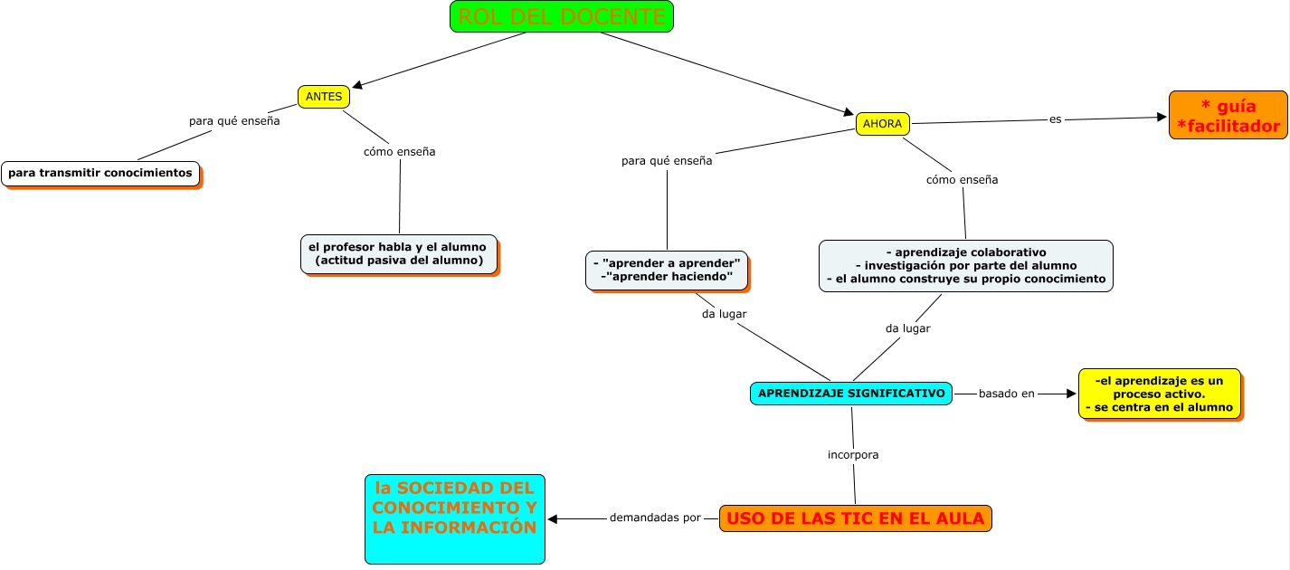 Este Cmap, tiene información relacionada con: EL ROL DEL PROFESOR_garcia_alvarez_M, AHORA para qué enseña - "aprender a aprender" -"aprender haciendo", APRENDIZAJE SIGNIFICATIVO incorpora USO DE LAS TIC EN EL AULA, AHORA cómo enseña - aprendizaje colaborativo - investigación por parte del alumno - el alumno construye su propio conocimiento, AHORA es * guía *facilitador, ANTES cómo enseña el profesor habla y el alumno (actitud pasiva del alumno), USO DE LAS TIC EN EL AULA demandadas por la SOCIEDAD DEL CONOCIMIENTO Y LA INFORMACIÓN, - aprendizaje colaborativo - investigación por parte del alumno - el alumno construye su propio conocimiento da lugar APRENDIZAJE SIGNIFICATIVO, ROL DEL DOCENTE ???? AHORA, APRENDIZAJE SIGNIFICATIVO basado en -el aprendizaje es un proceso activo. - se centra en el alumno, - "aprender a aprender" -"aprender haciendo" da lugar APRENDIZAJE SIGNIFICATIVO, ROL DEL DOCENTE ???? ANTES, ANTES para qué enseña para transmitir conocimientos
