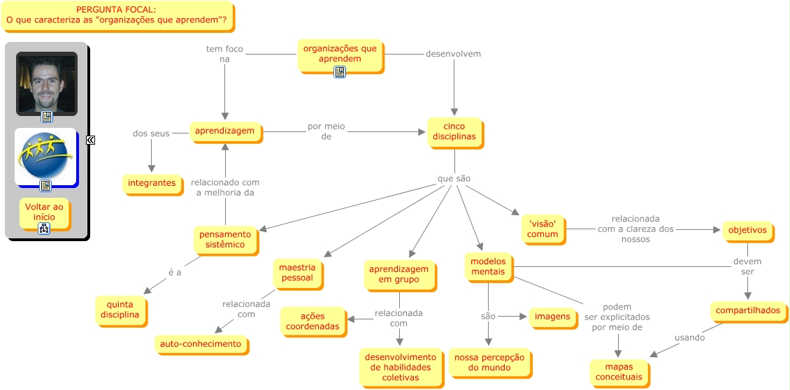 Esse mapa conceitual, produzido no IHMC CmapTools, tem a informação relacionada a: LearningOrg_v1, organizações que aprendem desenvolvem cinco disciplinas, pensamento sistêmico relacionado com a melhoria da aprendizagem, aprendizagem em grupo relacionada com desenvolvimento de habilidades coletivas, 'visão' comum relacionada com a clareza dos nossos objetivos, modelos mentais são imagens, modelos mentais são nossa percepção do mundo, cinco disciplinas que são 'visão' comum, cinco disciplinas que são pensamento sistêmico, cinco disciplinas que são modelos mentais, cinco disciplinas que são maestria pessoal, pensamento sistêmico é a quinta disciplina, aprendizagem em grupo relacionada com ações coordenadas, modelos mentais devem ser compartilhados, cinco disciplinas que são aprendizagem em grupo, maestria pessoal relacionada com auto-conhecimento, aprendizagem por meio de cinco disciplinas, aprendizagem dos seus integrantes, modelos mentais podem ser explicitados por meio de mapas conceituais, objetivos devem ser compartilhados, compartilhados usando mapas conceituais