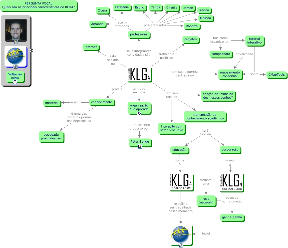 Esse mapa conceitual, produzido no IHMC CmapTools, tem a informação relacionada a: KLG4_v1, projetos tais como organizar um tutorial interativo, rede (network) baseada numa relação ganha-ganha, professores pós-graduados Jerson, tem seu foco na interação com setor produtivo, conhecimento é algo imaterial, tem sua expertise centrada no mapeamento conceitual, organização que aprende é um conceito proposto por Peter Senge, transmissão de conhecimento acadêmico terá foco na corporação, rede (network) inclui, professores pós-graduados Crizélia, formam uma rede (network), corporação forma a, professores pós-graduados Carlos, professores pós-graduados Bruno, professores pós-graduados Melissa, seus integrantes convidados são professores, professores recém- formados Cícera, professores pós-graduados Roberta, educação forma a, tutorial interativo sobre mapeamento conceitual