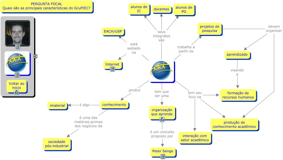 Esse mapa conceitual, produzido no IHMC CmapTools, tem a informação relacionada a: GruPIEC_v1, projetos de pesquisa devem organizar aprendizado, tem seu foco na formação de recursos humanos, está sediado na Internet, organização que aprende é um conceito proposto por Peter Senge, seus integrates são alunos de IC, tem seu foco na produção de conhecimento acadêmico, conhecimento é uma das matérias-primas dos negócios da sociedade pós-industrial, seus integrates são docentes, conhecimento é algo imaterial, aprendizado visando a formação de recursos humanos, tem que ser uma organização que aprende, seus integrates são alunos de PG, está sediado na EACH/USP, tem seu foco na interação com setor acadêmico, trabalha a partir de projetos de pesquisa, produz conhecimento, projetos de pesquisa devem organizar produção de conhecimento acadêmico