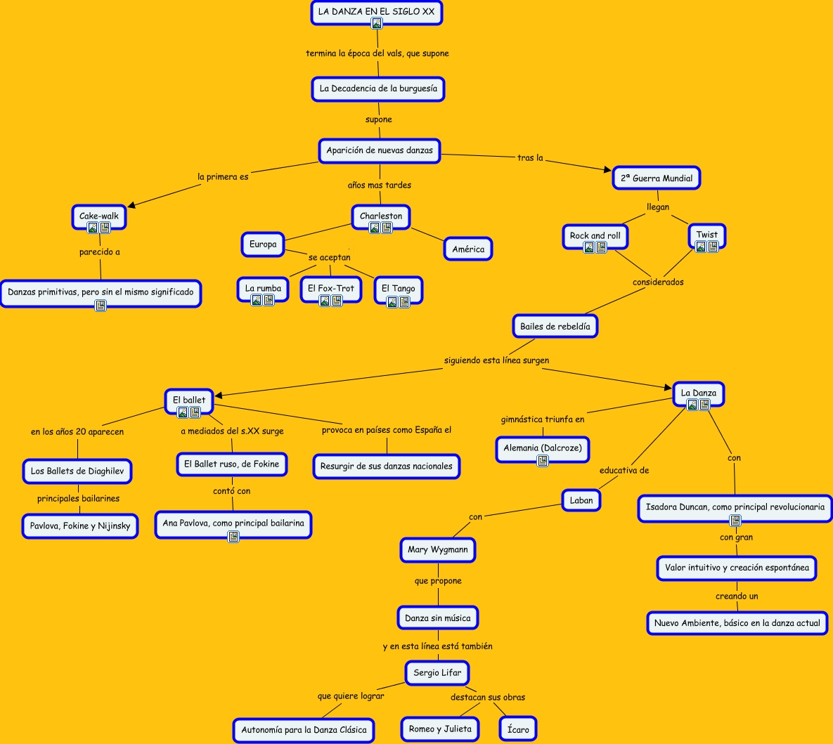 Este Cmap, tiene información relacionada con: La Danza en el siglo XX, Laban con Mary Wygmann, Danza sin música y en esta línea está también Sergio Lifar, Charleston ???? Europa, La Danza con Isadora Duncan, como principal revolucionaria, Europa se aceptan El Tango, Sergio Lifar destacan sus obras Ícaro, El ballet en los años 20 aparecen Los Ballets de Diaghilev, Europa se aceptan El Fox-Trot, Sergio Lifar que quiere lograr Autonomía para la Danza Clásica, Aparición de nuevas danzas años mas tardes Charleston, Charleston ???? América, Aparición de nuevas danzas tras la 2ª Guerra Mundial, Aparición de nuevas danzas la primera es Cake-walk, Sergio Lifar destacan sus obras Romeo y Julieta, El ballet a mediados del s.XX surge El Ballet ruso, de Fokine, Rock and roll considerados Bailes de rebeldía, LA DANZA EN EL SIGLO XX termina la época del vals, que supone La Decadencia de la burguesía, Cake-walk parecido a Danzas primitivas, pero sin el mismo significado, La Danza educativa de Laban, Charleston ???? Europa