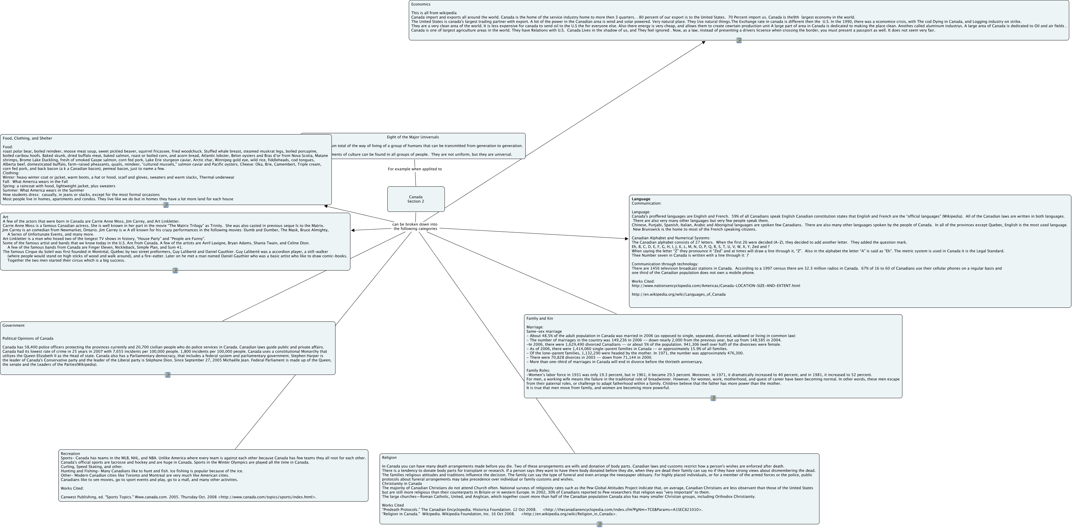 This Concept Map, created with IHMC CmapTools, has information related to: Cultural Universals(2), Canada Section 2 can be broken down into the following categories Recreation Sports- Canada has teams in the MLB, NHL, and NBA. Unlike America where every team is against each other because Canada has few teams they all root for each other. Canada's official sports are lacrosse and hockey and are huge in Canada. Sports in the Winter Olympics are played all the time in Canada. Curling, Speed Skating, and other. Hunting and Fishing- Many Canadians like to hunt and fish. Ice fishing is popular because of the ice. Other- Modern Canadian cities like Toronto and Montreal are very much like American cities. Canadians like to see movies, go to sport events and play, go to a mall, and many other activities. Works Cited: Canwest Publishing, ed. "Sports Topics." Www.canada.com. 2005. Thursday Oct. 2008 <http://www.canada.com/topics/sports/index.html>., Canada Section 2 can be broken down into the following categories Food, Clothing, and Shelter Food: roast polar bear, boiled reindeer, moose meat soup, sweet pickled beaver, squirrel fricassee, fried woodchuck. Stuffed whale breast, steamed muskrat legs, boiled porcupine, boiled caribou hoofs. Baked skunk, dried buffalo meat, baked salmon, roast or boiled corn, and acorn bread, Atlantic lobster, Belon oysters and Bras d’or from Nova Scotia, Matane shrimps, Brome Lake Duckling, fresh of smoked Gaspe salmon, corn fed pork, Lake Erie sturgeon caviar, Arctic char, Winnipeg gold eye, wild rice, fiddleheads, cod tongues, Alberta beef, domesticated buffalo, farm-raised pheasants, quails, reindeer, “cultured mussels,” salmon caviar and Pacific oysters. Cheese: Oka, Brie, Camembert, Triple cream, corn fed pork, and back bacon (a k a Canadian bacon), pemeal bacon, just to name a few. Clothing: Winter: heavy winter coat or jacket, warm boots, a hat or hood, scarf and gloves, sweaters and warm slacks, Thermal underwear Fall: What America wears in the Fall Spring: a raincoat with hood, lightweight jacket, plus sweaters Summer: What America wears in the Summer How students dress: casually, in jeans or slacks, except for the most formal occasions Most people live in homes, apartments and condos. They live like we do but in homes they have a lot more land for each house, Canada Section 2 can be broken down into the following categories Famliy and Kin Marriage: Same-sex marriage - About 48.5% of the adult population in Canada was married in 2006 (as opposed to single, separated, divorced, widowed or living in common law) - The number of marriages in the country was 149,236 in 2006 -- down nearly 2,000 from the previous year, but up from 148,585 in 2004. -In 2006, there were 1,629,490 divorced Canadians -- or about 5% of the population. 941,306 (well over half) of the divorcees were female. - As of 2006, there were 1,414,060 single-parent families in Canada -- or approximately 15.9% of all families. - Of the lone-parent families, 1,132,290 were headed by the mother. In 1971, the number was approximately 476,300. - There were 70,828 divorces in 2003 -- down from 71,144 in 2000. - More than one-third of marriages in Canada will end in divorce before the thirtieth anniversary. Family Roles: -Women’s labor force in 1931 was only 19.3 percent, but in 1961, it became 29.5 percent. Moreover, in 1971, it dramatically increased to 40 percent, and in 1981, it increased to 52 percent. For men, a working wife means the failure in the traditional role of breadwinner. However, for women, work, motherhood, and quest of career have been becoming normal. In other words, these men escape from their paternal roles, or challenge to adapt fatherhood within a family. Children believe that the father has more power than the mother. It is true that men move from family, and women are becoming more powerful., Canada Section 2 can be broken down into the following categories Language Communication: Language: Canada's proffered languages are English and French. 59% of all Canadians speak English Canadian constitution states that English and French are the “official languages” (Wikipedia). All of the Canadian laws are written in both languages. There are also very many other languages but very few people speak them. Chinese, Punjabi, Spanish, Italian, Arabic and Aboriginal languages are spoken few Canadians. There are also many other languages spoken by the people of Canada. In all of the provinces except Quebec, English is the most used language. New Brunswick is the home to most of the French speaking citizens. Canadian Alphabet and Numerical Systems: The Canadian alphabet consists of 27 letters. When the first 26 were decided (A-Z), they decided to add another letter. They added the question mark. Eh, B, C, D, E, F, G, H, I, J, K, L, M, N, O, P, Q, R, S, T, U, V, W, X, Y, Zed and ? When saying the letter “Z” they pronounce it “Zed” and at times will draw a line through it, “Z”. Also in the alphabet the letter “A” is said as “Eh”. The metric system is used in Canada it is the Legal Standard. Thee Number seven in Canada is written with a line through it: 7 Communication through technology: There are 1456 television broadcast stations in Canada. According to a 1997 census there are 32.3 million radios in Canada. 67% of 16 to 60 of Canadians use their cellular phones on a regular basis and one third of the Canadian population does not own a mobile phone. Works Cited: http://www.nationsencyclopedia.com/Americas/Canada-LOCATION-SIZE-AND-EXTENT.html http://en.wikipedia.org/wiki/Languages_of_Canada, Eight of the Major Universals Culture - The sum total of the way of living of a group of humans that can be transmitted from generation to generation. These elements of culture can be found in all groups of people. They are not uniform, but they are universal. For example when applited to Canada Section 2, Canada Section 2 can be broken down into the following categories Econo