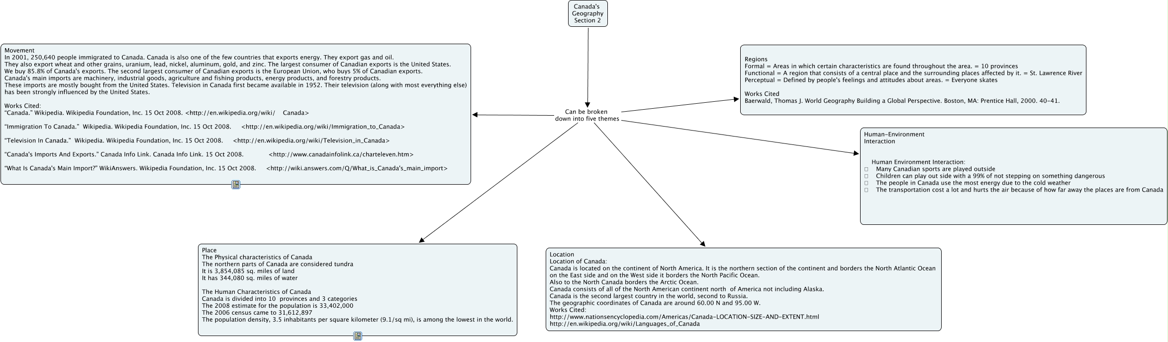 This Concept Map, created with IHMC CmapTools, has information related to: Canada's Geography(2), Canada's Geography Section 2 Can be broken down into five themes Regions Formal = Areas in which certain characteristics are found throughout the area. = 10 provinces Functional = A region that consists of a central place and the surrounding places affected by it. = St. Lawrence River Perceptual = Defined by people's feelings and attitudes about areas. = Everyone skates Works Cited Baerwald, Thomas J. World Geography Building a Global Perspective. Boston, MA: Prentice Hall, 2000. 40-41., Canada's Geography Section 2 Can be broken down into five themes Place The Physical characteristics of Canada The northern parts of Canada are considered tundra It is 3,854,085 sq. miles of land It has 344,080 sq. miles of water The Human Characteristics of Canada Canada is divided into 10 provinces and 3 categories The 2008 estimate for the population is 33,402,000 The 2006 census came to 31,612,897 The population density, 3.5 inhabitants per square kilometer (9.1/sq mi), is among the lowest in the world., Canada's Geography Section 2 Can be broken down into five themes Human-Environment Interaction Human Environment Interaction: Many Canadian sports are played outside Children can play out side with a 99% of not stepping on something dangerous The people in Canada use the most energy due to the cold weather The transportation cost a lot and hurts the air because of how far away the places are from Canada, Canada's Geography Section 2 Can be broken down into five themes Movement In 2001, 250,640 people immigrated to Canada. Canada is also one of the few countries that exports energy. They export gas and oil. They also export wheat and other grains, uranium, lead, nickel, aluminum, gold, and zinc. The largest consumer of Canadian exports is the United States. We buy 85.8% of Canada's exports. The second largest consumer of Canadian exports is the European Union, who buys 5% of Canadian exports. Canada's main imports are machinery, industrial goods, agriculture and fishing products, energy products, and forestry products. These imports are mostly bought from the United States. Television in Canada first became available in 1952. Their television (along with most everything else) has been strongly influenced by the United States. Works Cited: “Canada.” Wikipedia. Wikipedia Foundation, Inc. 15 Oct 2008. <http://en.wikipedia.org/wiki/ Canada> “Immigration To Canada.” Wikipedia. Wikipedia Foundation, Inc. 15 Oct 2008. <http://en.wikipedia.org/wiki/Immigration_to_Canada> “Television In Canada.” Wikipedia. Wikipedia Foundation, Inc. 15 Oct 2008. <http://en.wikipedia.org/wiki/Television_in_Canada> “Canada's Imports And Exports.” Canada Info Link. Canada Info Link. 15 Oct 2008. <http://www.canadainfolink.ca/charteleven.htm> “What Is Canada's Main Import?” WikiAnswers. Wikipedia Foundation, Inc. 15 Oct 2008. <http://wiki.answers.com/Q/What_is_Canada's_main_import>, Canada's Geography Section 2 Can be broken down into five themes Location Location of Canada: Canada is located on the continent of North America. It is the northern section of the continent and borders the North Atlantic Ocean on the East side and on the West side it borders the North Pacific Ocean. Also to the North Canada borders the Arctic Ocean. Canada consists of all of the North American continent north of America not including Alaska. Canada is the second largest country in the world, second to Russia. The geographic coordinates of Canada are around 60.00 N and 95.00 W. Works Cited: http://www.nationsencyclopedia.com/Americas/Canada-LOCATION-SIZE-AND-EXTENT.html http://en.wikipedia.org/wiki/Languages_of_Canada