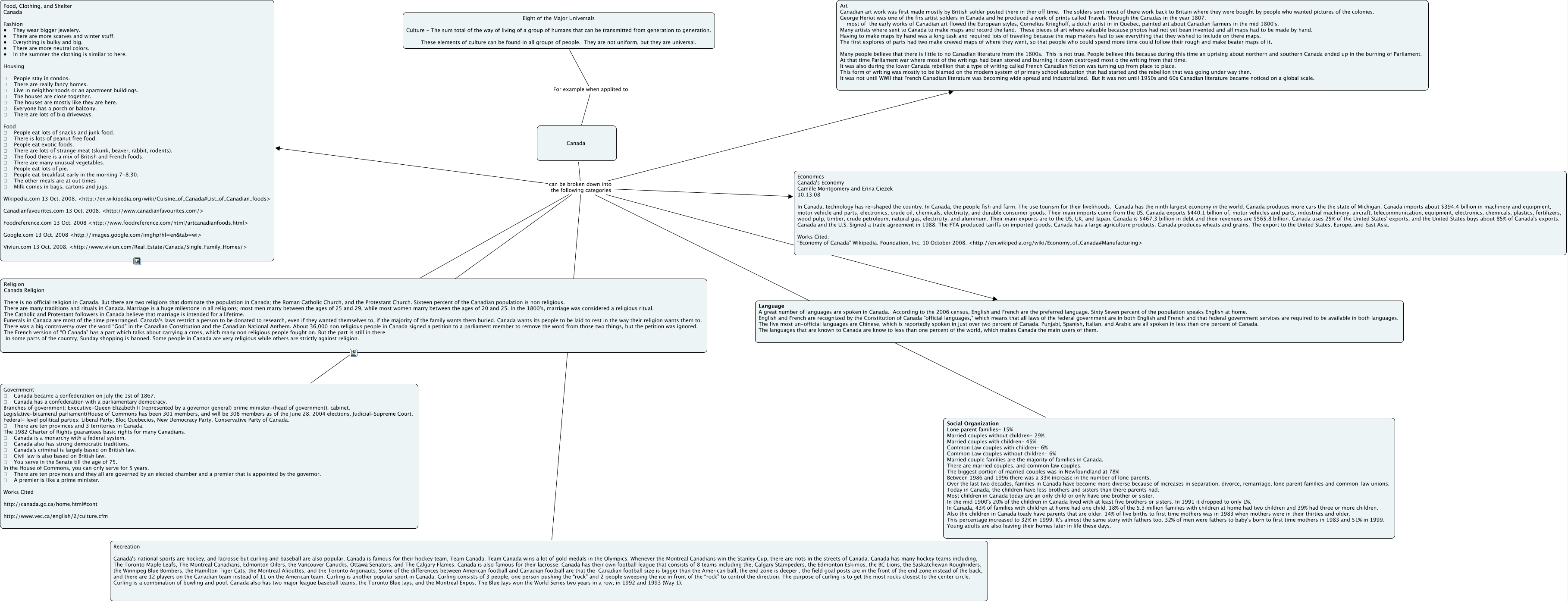 This Concept Map, created with IHMC CmapTools, has information related to: Cultural Universals(1), Eight of the Major Universals Culture - The sum total of the way of living of a group of humans that can be transmitted from generation to generation. These elements of culture can be found in all groups of people. They are not uniform, but they are universal. For example when applited to Canada, Canada can be broken down into the following categories Language A great number of languages are spoken in Canada. According to the 2006 census, English and French are the preferred language. Sixty Seven percent of the population speaks English at home. English and French are recognized by the Constitution of Canada "official languages," which means that all laws of the federal government are in both English and French and that federal government services are required to be available in both languages. The five most un-official languages are Chinese, which is reportedly spoken in just over two percent of Canada. Punjabi, Spanish, Italian, and Arabic are all spoken in less than one percent of Canada. The languages that are known to Canada are know to less than one percent of the world, which makes Canada the main users of them., Canada can be broken down into the following categories Social Organization Lone parent families- 15% Married couples without children- 29% Married couples with children- 45% Common Law couples with children- 6% Common Law couples without children- 6% Married couple families are the majority of families in Canada. There are married couples, and common law couples. The biggest portion of married couples was in Newfoundland at 78% Between 1986 and 1996 there was a 33% increase in the number of lone parents. Over the last two decades, families in Canada have become more diverse because of increases in separation, divorce, remarriage, lone parent families and common-law unions. Today in Canada, the children have less brothers and sisters than there parents had. Most children in Canada today are an only child or only have one brother or sister. In the mid 1900's 20% of the children in Canada lived with at least five brothers or sisters. In 1991 it dropped to only 1%. In Canada, 43% of families with children at home had one child, 18% of the 5.3 million families with children at home had two children and 39% had three or more children. Also the children in Canada toady have parents that are older. 14% of live births to first time mothers was in 1983 when mothers were in their thirties and older. This percentage increased to 32% in 1999. It's almost the same story with fathers too. 32% of men were fathers to baby's born to first time mothers in 1983 and 51% in 1999. Young adults are also leaving their homes later in life these days., Canada can be broken down into the following categories Food, Clothing, and Shelter Canada Fashion • They wear bigger jewelery. • There are more scarves and winter stuff. • Everything is bulky and big. • There are more neutral colors. • In the summer the clothing is similar to here. Housing People stay in condos. There are really fancy homes. Live in neighborhoods or an apartment buildings. The houses are close together. The houses are mostly like they are here. Everyone has a porch or balcony. There are lots of big driveways. Food People eat lots of snacks and junk food. There is lots of peanut free food. People eat exotic foods. There are lots of strange meat (skunk, beaver, rabbit, rodents). The food there is a mix of British and French foods. There are many unusual vegetables. People eat lots of pie. People eat breakfast early in the morning 7-8:30. The other meals are at out times Milk comes in bags, cartons and jugs. Wikipedia.com 13 Oct. 2008. <http://en.wikipedia.org/wiki/Cuisine_of_Canada#List_of_Canadian_foods> Canadianfavourites.com 13 Oct. 2008. <http://www.canadianfavourites.com/> Foodreference.com 13 Oct. 2008 <http://www.foodreference.com/html/artcanadianfoods.html> Google.com 13 Oct. 2008 <http://images.google.com/imghp?hl=en&tab=wi> Viviun.com 13 Oct. 2008. <http://www.viviun.com/Real_Estate/Canada/Single_Family_Homes/>, Canada can be broken down into the following categories Recreation Canada's national sports are hockey, and lacrosse but curling and baseball are also popular. Canada is famous for their hockey team, Team Canada. Team Canada wins a lot of gold medals in the Olympics. Whenever the Montreal Canadians win the Stanley Cup, there are riots in the streets of Canada. Canada has many hockey teams including, The Toronto Maple Leafs, The Montreal Canadians, Edmonton Oilers, the Vancouver Canucks, Ottawa Senators, and The Calgary Flames. Canada is also famous for their lacrosse. Canada has their own football league that consists of 8 teams including the, Calgary Stampeders, the Edmonton Eskimos, the BC Lions, the Saskatchewan Roughriders, the Winnipeg Blue Bombers, the Hamilton Tiger Cats, the Montreal Aliouttes, and the Toronto Argonauts. Some of the differences between American football and Canadian football are that the Canadian football size is bigger than the American ball, the end zone is deeper , the field goal posts are in the front of the end zone instead of the back, and there are 12 players on the Canadian team instead of 11 on the American team. Curling is another popular sport in Canada. Curling consists of 3 people, one person pushing the “rock” and 2 people sweeping the ice in front of the “rock” to control the direction. The purpose of curling is to get the most rocks closest to the center circle. Curling is a combination of bowling and pool. Canada also has two major league baseball teams, the Toronto Blue Jays, and the Montreal Expos. The Blue Jays won the World Series two years in a row, in 1992 and 1993 (Way 1)., Canada can be broken down into the following categories Religion Canada Religion There is no official religion in Canada. But there are two religions that dominate the population in 