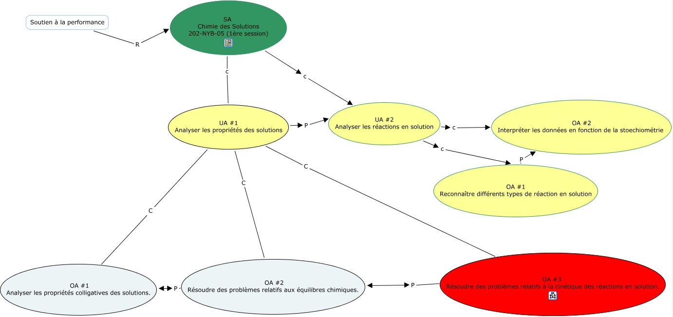 Cette carte conceptuelle, cree avec IHMC CmapTools, contient des informations liees a : SA, SA Chimie des Solutions 202-NYB-05 (1ère session) c UA #2 Analyser les réactions en solution, UA #2 Analyser les réactions en solution c OA #2 Interpréter les données en fonction de la stoechiométrie, UA #2 Analyser les réactions en solution c OA #1 Reconnaître différents types de réaction en solution, OA #2 Résoudre des problèmes relatifs aux équilibres chimiques. P OA #3 Résoudre des problèmes relatifs à la cinétique des réactions en solution., UA #1 Analyser les propriétés des solutions C OA #1 Analyser les propriétés colligatives des solutions., UA #1 Analyser les propriétés des solutions P UA #2 Analyser les réactions en solution, UA #1 Analyser les propriétés des solutions C OA #3 Résoudre des problèmes relatifs à la cinétique des réactions en solution., OA #1 Reconnaître différents types de réaction en solution P OA #2 Interpréter les données en fonction de la stoechiométrie, Soutien à la performance R SA Chimie des Solutions 202-NYB-05 (1ère session), OA #1 Analyser les propriétés colligatives des solutions. P OA #2 Résoudre des problèmes relatifs aux équilibres chimiques.