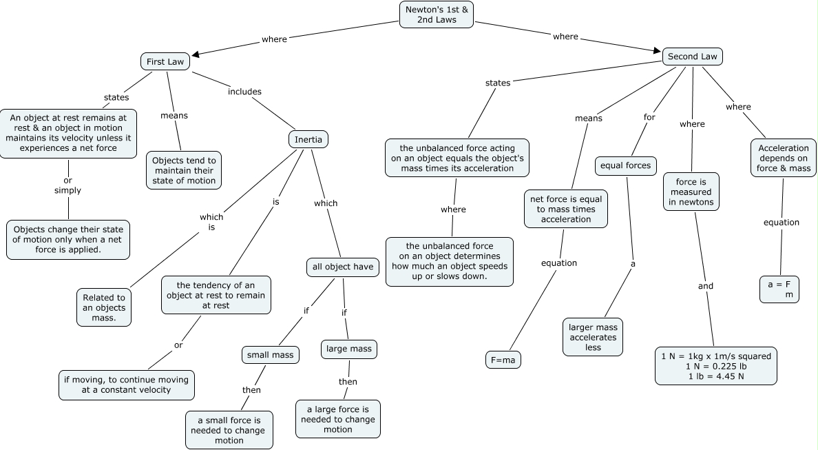 This Concept Map, created with IHMC CmapTools, has information related to: Newtons Laws 1,2, Newton's 1st & 2nd Laws where First Law, Acceleration depends on force & mass equation a = F m, First Law includes Inertia, all object have if large mass, Second Law where Acceleration depends on force & mass, First Law states An object at rest remains at rest & an object in motion maintains its velocity unless it experiences a net force, equal forces a larger mass accelerates less, Newton's 1st & 2nd Laws where Second Law, First Law means Objects tend to maintain their state of motion, Second Law states the unbalanced force acting on an object equals the object's mass times its acceleration, Inertia which is Related to an objects mass., the tendency of an object at rest to remain at rest or if moving, to continue moving at a constant velocity, all object have if small mass, small mass then a small force is needed to change motion, the unbalanced force acting on an object equals the object's mass times its acceleration where the unbalanced force on an object determines how much an object speeds up or slows down., An object at rest remains at rest & an object in motion maintains its velocity unless it experiences a net force or simply Objects change their state of motion only when a net force is applied., large mass then a large force is needed to change motion, Second Law for equal forces, force is measured in newtons and 1 N = 1kg x 1m/s squared 1 N = 0.225 lb 1 lb = 4.45 N, Inertia is the tendency of an object at rest to remain at rest