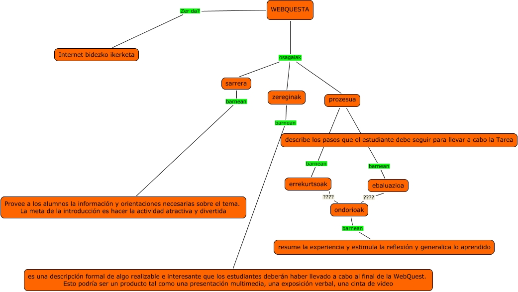 This Concept Map has information related to: mapa kontzeptuala, prozesua barnean errekurtsoak, WEBQUESTA osagaiak zereginak, ondorioak ???? errekurtsoak, prozesua barnean ebaluazioa, WEBQUESTA osagaiak sarrera, sarrera barnean Provee a los alumnos la información y orientaciones necesarias sobre el tema. La meta de la introducción es hacer la actividad atractiva y divertida, ondorioak ???? ebaluazioa, WEBQUESTA osagaiak prozesua, WEBQUESTA Zer da? Internet bidezko ikerketa, ondorioak barnean resume la experiencia y estimula la reflexión y generalica lo aprendido