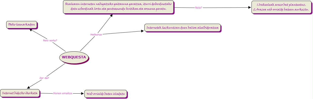 This Concept Map has information related to: Webquesta, Ikaslearen interneten nabigatzeko gaitasuna garatzea, iturri desberdinetako datu ezberdinak lortu eta pentsamendu kritikoa eta sormena garatu. Nola? 1.Irakasleak arazo bat planteatuz. 2.Arazoa web orrialde batean aurkeztu., WEBQUESTA Helburua Ikaslearen interneten nabigatzeko gaitasuna garatzea, iturri desberdinetako datu ezberdinak lortu eta pentsamendu kritikoa eta sormena garatu., WEBQUESTA Zer da? Internet bidezko ikerketa, WEBQUESTA Helburua Internetek hezkuntzan duen balioa ahalbideratzea, Internet bidezko ikerketa Honen emaitza Web orrialde baten isladatu, WEBQUESTA Noiz sortu? 90eko hamarkadan
