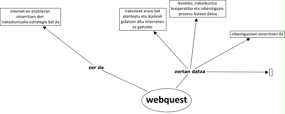 This Concept Map has information related to: webquest, webquest zertan datza irakasleak arazo bat planteatu eta ikasleak gidatzen ditu interneten ez galtzeko, webquest zertan datza ikasteko, irakaskuntza kooperatibo eta inberstigazio prozesu batean datza, webquest zertan datza , webquest zer da internet-en erabileran oinarritzen den irakaskuntzako estrategia bat da, webquest zertan datza inbestigazioan oinarritzen da