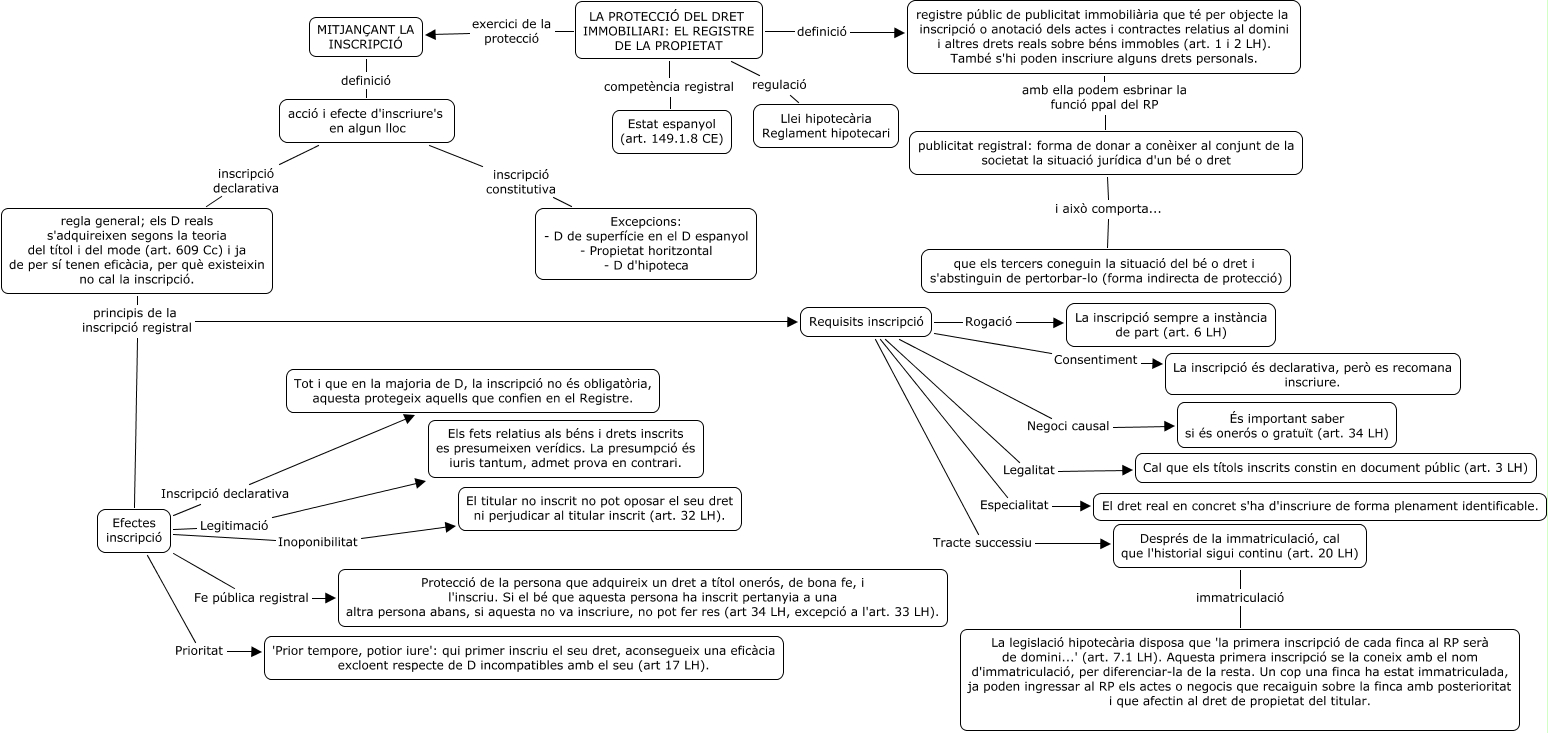 Este Cmap, tiene información relacionada con: Mapa civil català, LA PROTECCIÓ DEL DRET IMMOBILIARI: EL REGISTRE DE LA PROPIETAT regulació Llei hipotecària Reglament hipotecari, acció i efecte d'inscriure's en algun lloc inscripció constitutiva Excepcions: - D de superfície en el D espanyol - Propietat horitzontal - D d'hipoteca, Requisits inscripció Tracte successiu Després de la immatriculació, cal que l'historial sigui continu (art. 20 LH), Requisits inscripció Consentiment La inscripció és declarativa, però es recomana inscriure., Efectes inscripció Fe pública registral Protecció de la persona que adquireix un dret a títol onerós, de bona fe, i l'inscriu. Si el bé que aquesta persona ha inscrit pertanyia a una altra persona abans, si aquesta no va inscriure, no pot fer res (art 34 LH, excepció a l'art. 33 LH)., Efectes inscripció Inscripció declarativa Tot i que en la majoria de D, la inscripció no és obligatòria, aquesta protegeix aquells que confien en el Registre., publicitat registral: forma de donar a conèixer al conjunt de la societat la situació jurídica d'un bé o dret i això comporta... que els tercers coneguin la situació del bé o dret i s'abstinguin de pertorbar-lo (forma indirecta de protecció), Requisits inscripció Rogació La inscripció sempre a instància de part (art. 6 LH), registre públic de publicitat immobiliària que té per objecte la inscripció o anotació dels actes i contractes relatius al domini i altres drets reals sobre béns immobles (art. 1 i 2 LH). També s'hi poden inscriure alguns drets personals. amb ella podem esbrinar la funció ppal del RP publicitat registral: forma de donar a conèixer al conjunt de la societat la situació jurídica d'un bé o dret, regla general; els D reals s'adquireixen segons la teoria del títol i del mode (art. 609 Cc) i ja de per sí tenen eficàcia, per què existeixin no cal la inscripció. principis de la inscripció registral Efectes inscripció, Efectes inscripció Inoponibilitat El titular no inscrit no pot oposar el seu dret ni perjudicar al titular inscrit (art. 32 LH)., Requisits inscripció Especialitat El dret real en concret s'ha d'inscriure de forma plenament identificable., Requisits inscripció Negoci causal És important saber si és onerós o gratuït (art. 34 LH), regla general; els D reals s'adquireixen segons la teoria del títol i del mode (art. 609 Cc) i ja de per sí tenen eficàcia, per què existeixin no cal la inscripció. principis de la inscripció registral Requisits inscripció, acció i efecte d'inscriure's en algun lloc inscripció declarativa regla general; els D reals s'adquireixen segons la teoria del títol i del mode (art. 609 Cc) i ja de per sí tenen eficàcia, per què existeixin no cal la inscripció., Després de la immatriculació, cal que l'historial sigui continu (art. 20 LH) immatriculació La legislació hipotecària disposa que 'la primera inscripció de cada finca al RP serà de domini...' (art. 7.1 LH). Aquesta primera inscripció se la coneix amb el nom d'immatriculació, per diferenciar-la de la resta. Un cop una finca ha estat immatriculada, ja poden ingressar al RP els actes o negocis que recaiguin sobre la finca amb posterioritat i que afectin al dret de propietat del titular., LA PROTECCIÓ DEL DRET IMMOBILIARI: EL REGISTRE DE LA PROPIETAT exercici de la protecció MITJANÇANT LA INSCRIPCIÓ, LA PROTECCIÓ DEL DRET IMMOBILIARI: EL REGISTRE DE LA PROPIETAT definició registre públic de publicitat immobiliària que té per objecte la inscripció o anotació dels actes i contractes relatius al domini i altres drets reals sobre béns immobles (art. 1 i 2 LH). També s'hi poden inscriure alguns drets personals., Requisits inscripció Legalitat Cal que els títols inscrits constin en document públic (art. 3 LH), Efectes inscripció Legitimació Els fets relatius als béns i drets inscrits es presumeixen verídics. La presumpció és iuris tantum, admet prova en contrari.