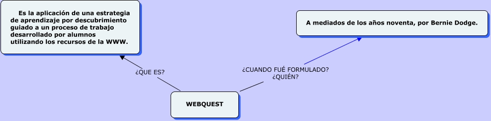 This Concept Map has information related to: Webquest, WEBQUEST ¿QUE ES? Es la aplicación de una estrategia de aprendizaje por descubrimiento guiado a un proceso de trabajo desarrollado por alumnos utilizando los recursos de la WWW., WEBQUEST ¿CUANDO FUÉ FORMULADO? ¿QUIÉN? A mediados de los años noventa, por Bernie Dodge.