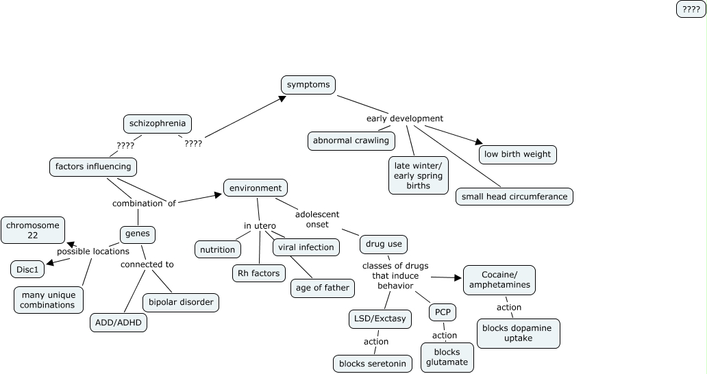 This Concept Map, created with IHMC CmapTools, has information related to: Nancy's map, symptoms early development low birth weight, environment adolescent onset drug use, genes possible locations many unique combinations, genes possible locations Disc1, environment in utero Rh factors, symptoms early development small head circumferance, environment in utero viral infection, environment in utero age of father, Cocaine/ amphetamines action blocks dopamine uptake, drug use classes of drugs that induce behavior LSD/Exctasy, schizophrenia ???? factors influencing, symptoms early development abnormal crawling, LSD/Exctasy action blocks seretonin, drug use classes of drugs that induce behavior Cocaine/ amphetamines, drug use classes of drugs that induce behavior PCP, factors influencing of environment, factors influencing combination genes, genes connected to bipolar disorder, schizophrenia ???? symptoms, genes possible locations chromosome 22