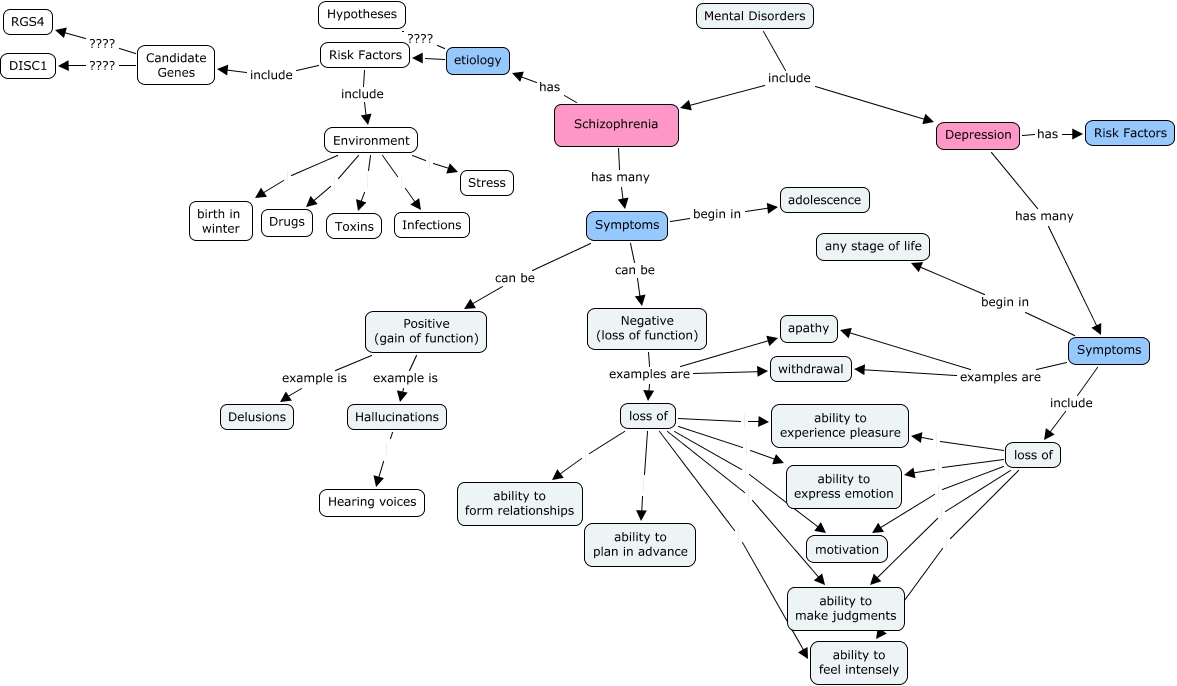 This Concept Map, created with IHMC CmapTools, has information related to: schizo, Candidate Genes ???? DISC1, Symptoms can be Positive (gain of function), Positive (gain of function) example is Hallucinations, Risk Factors include Candidate Genes, loss of ability to make judgments, Mental Disorders include Schizophrenia, loss of motivation, loss of ability to express emotion, Environment Stress, loss of ability to make judgments, loss of ability to plan in advance, etiology Risk Factors, loss of ability to feel intensely, loss of ability to form relationships, Negative (loss of function) examples are withdrawal, Depression has many Symptoms, Schizophrenia has many Symptoms, loss of motivation, Hallucinations Hearing voices, loss of ability to feel intensely