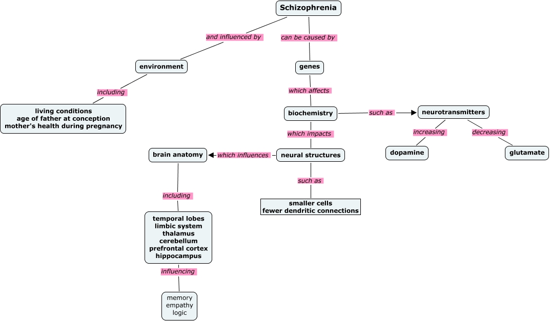 This Concept Map, created with IHMC CmapTools, has information related to: Jeff's Maps, neural structures which influences brain anatomy, neural structures such as smaller cells fewer dendritic connections, environment including living conditions age of father at conception mother's health during pregnancy, temporal lobes limbic system thalamus cerebellum prefrontal cortex hippocampus influencing memory empathy logic, brain anatomy including temporal lobes limbic system thalamus cerebellum prefrontal cortex hippocampus, biochemistry which impacts neural structures, genes which affects biochemistry, biochemistry such as neurotransmitters, neurotransmitters increasing dopamine, Schizophrenia can be caused by genes, Schizophrenia and influenced by environment, neurotransmitters decreasing glutamate
