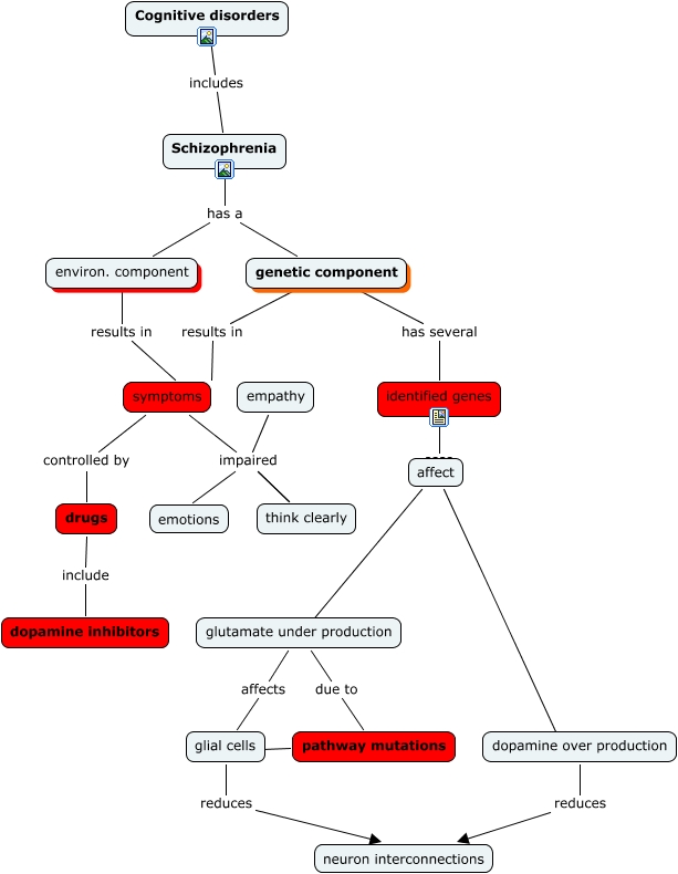 This Concept Map, created with IHMC CmapTools, has information related to: polly, genetic component has several identified genes, drugs include dopamine inhibitors, glutamate under production affects glial cells, dopamine over production reduces neuron interconnections, identified genes ???? affect, empathy impaired emotions, symptoms impaired think clearly, genetic component results in symptoms, glutamate under production due to pathway mutations, symptoms controlled by drugs, symptoms impaired emotions, Schizophrenia has a environ. component, affect ???? glutamate under production, affect ???? dopamine over production, pathway mutations ???? glial cells, Cognitive disorders includes Schizophrenia, Schizophrenia has a genetic component, empathy impaired think clearly, environ. component results in symptoms, symptoms impaired think clearly