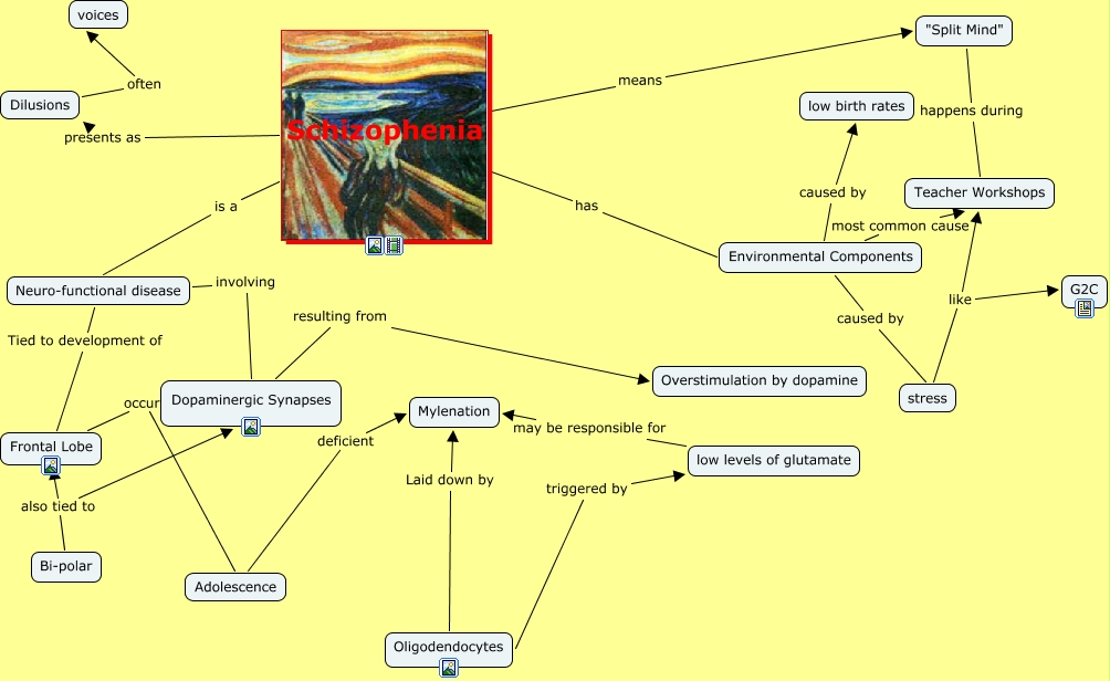 This Concept Map, created with IHMC CmapTools, has information related to: G2CSchizophreniaBallog, Adolescence deficient Mylenation, Dopaminergic Synapses resulting from Overstimulation by dopamine, low levels of glutamate may be responsible for Mylenation, Environmental Components caused by low birth rates, Environmental Components most common cause Teacher Workshops, Schizophenia presents as Dilusions, Dilusions often voices, Neuro-functional disease Tied to development of Frontal Lobe, Environmental Components caused by stress, Schizophenia means "Split Mind", Frontal Lobe occurs Adolescence, stress like G2C, Oligodendocytes Laid down by Mylenation, Oligodendocytes triggered by low levels of glutamate, Schizophenia is a Neuro-functional disease, stress like Teacher Workshops, Bi-polar also tied to Frontal Lobe, Neuro-functional disease involving Dopaminergic Synapses, Bi-polar also tied to Dopaminergic Synapses, "Split Mind" happens during Teacher Workshops