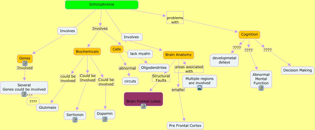 This Concept Map, created with IHMC CmapTools, has information related to: Odegaards cmap, Cells abnormal circuts, Cells ???? Oligodendrites, Brain Anatomy smaller Pre Frontal Cortex, Cognition ???? Decision Making, Schizophrenia Genes, Brain Anatomy Structural Faults Brain Frontal Lobes, Genes Involved Several Genes could be involved, Cognition ???? Abnormal Mental Function, Schizophrenia Involves Cells, Biochemicals Could be involved Dopamin, Schizophrenia Brain Anatomy, Schizophrenia problems with Cognition, Biochemicals Could be Involved Seritonon, Schizophrenia Involves Biochemicals, Brain Anatomy areas assiciated with Multiple regions are involved, Cognition ???? developmetal delays, Biochemicals could be involved Glutimate, Several Genes could be involved ???? ????