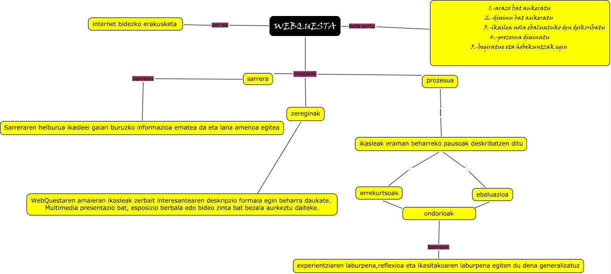 This Concept Map has information related to: Izenik gabe 2, ondorioak ???? ebaluazioa, sarrera barnean Sarreraren helburua ikasleei gaiari buruzko informazioa ematea da eta lana amenoa egitea, WEBQUESTA nola sortu 1.-arazo bat aukeratu 2.-diseinu bat aukeratu 3.-ikaslea nola ebaluatuko den deskrribatu 4.-prozesua diseinatu 5.-begiratue eta hobekuntzak egin, ebaluazioa ikasleak eraman beharreko pausoak deskribatzen ditu, WEBQUESTA zer da internet bidezko erakusketa, WEBQUESTA osagaiak sarrera, WEBQUESTA osagaiak zereginak, ondorioak barnean experientziaren laburpena,reflexioa eta ikasitakoaren laburpena egiten du dena generalizatuz, prozesua ikasleak eraman beharreko pausoak deskribatzen ditu, ondorioak ???? errekurtsoak