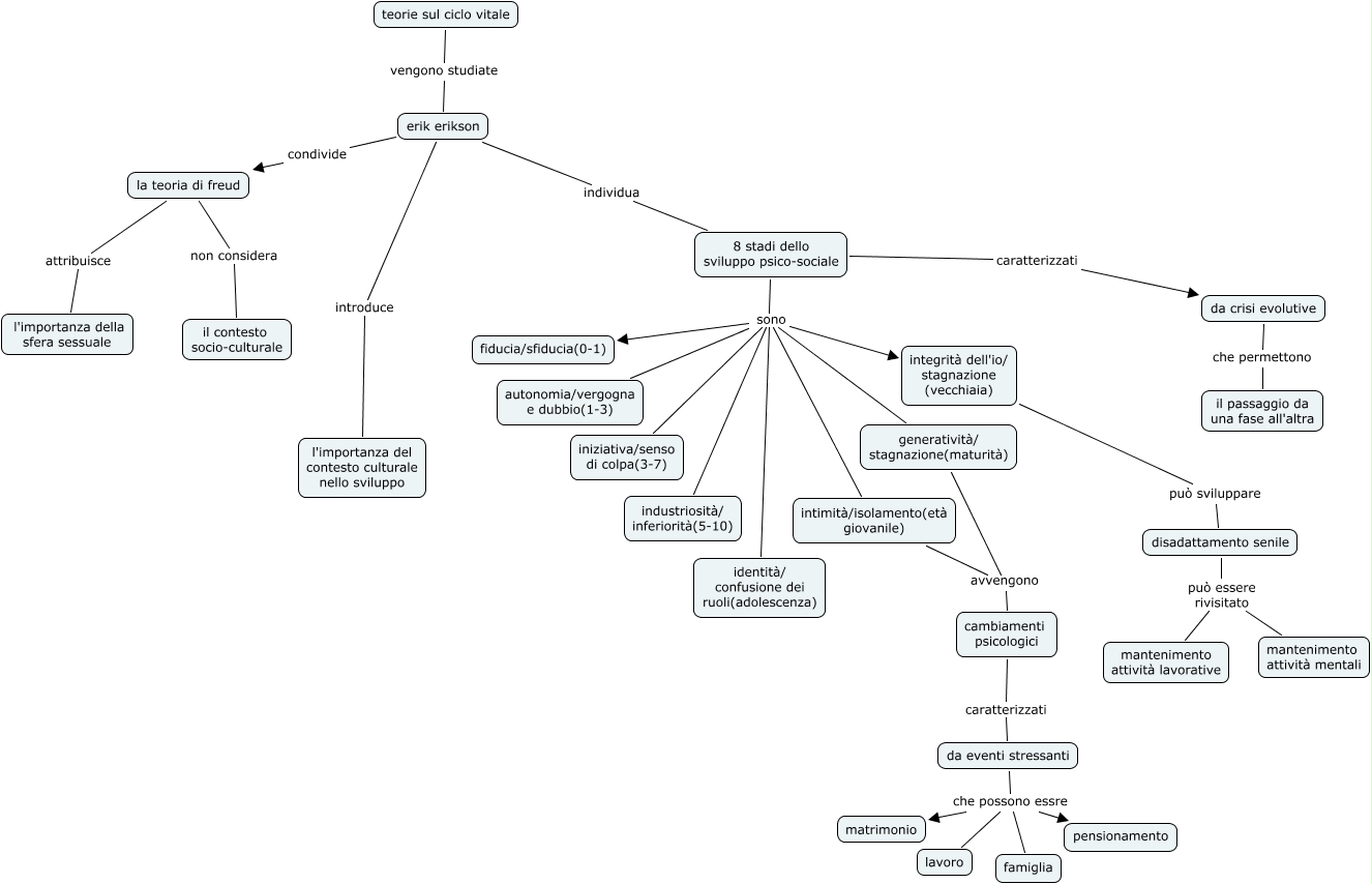 teorie sul ciclo vitale, 8 stadi dello sviluppo psico-sociale sono iniziativa/senso di colpa(3-7), da crisi evolutive che permettono il passaggio da una fase all'altra, da eventi stressanti che possono essre famiglia, da eventi stressanti che possono essre pensionamento, la teoria di freud non considera il contesto socio-culturale, 8 stadi dello sviluppo psico-sociale sono generatività/ stagnazione(maturità), 8 stadi dello sviluppo psico-sociale sono integrità dell'io/ stagnazione (vecchiaia), la teoria di freud attribuisce l'importanza della sfera sessuale, 8 stadi dello sviluppo psico-sociale sono identità/ confusione dei ruoli(adolescenza), intimità/isolamento(età giovanile) avvengono cambiamenti psicologici