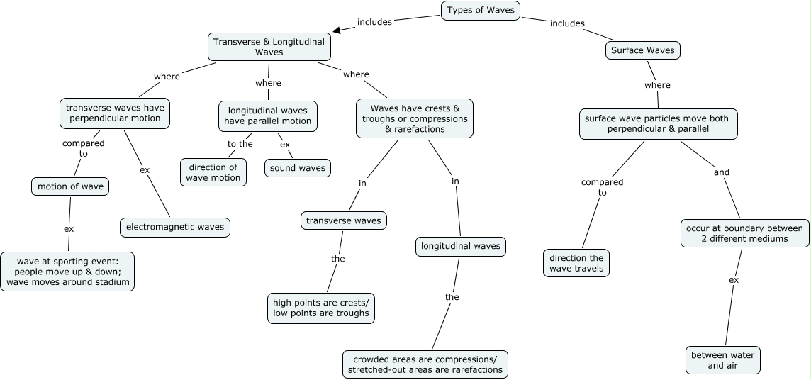 This Concept Map, created with IHMC CmapTools, has information related to: Types of Waves 2, Waves have crests & troughs or compressions & rarefactions in longitudinal waves, Types of Waves includes Transverse & Longitudinal Waves, transverse waves have perpendicular motion compared to motion of wave, Transverse & Longitudinal Waves where longitudinal waves have parallel motion, surface wave particles move both perpendicular & parallel and occur at boundary between 2 different mediums, transverse waves the high points are crests/ low points are troughs, longitudinal waves have parallel motion to the direction of wave motion, Transverse & Longitudinal Waves where transverse waves have perpendicular motion, Types of Waves includes Surface Waves, motion of wave ex wave at sporting event: people move up & down; wave moves around stadium, Transverse & Longitudinal Waves where Waves have crests & troughs or compressions & rarefactions, Surface Waves where surface wave particles move both perpendicular & parallel, Waves have crests & troughs or compressions & rarefactions in transverse waves, occur at boundary between 2 different mediums ex between water and air, transverse waves have perpendicular motion ex electromagnetic waves, surface wave particles move both perpendicular & parallel compared to direction the wave travels, longitudinal waves have parallel motion ex sound waves, longitudinal waves the crowded areas are compressions/ stretched-out areas are rarefactions