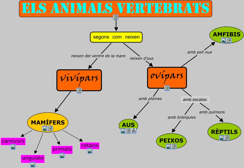 Aquest mapa conceptual conté informació relacionada amb: animals vertebrats, MAMÍFERS cetacis, ELS ANIMALS VERTEBRATS segons com neixen, amb escates amb brànquies PEIXOS, MAMÍFERS primats, MAMÍFERS carnívors, ovípars amb pell nua AMFIBIS, segons com neixen neixen d'ous ovípars, ovípars amb escates, segons com neixen neixen del ventre de la mare vivípars, ovípars amb plomes AUS, MAMÍFERS ungulats, vivípars MAMÍFERS, amb escates amb pulmons RÈPTILS