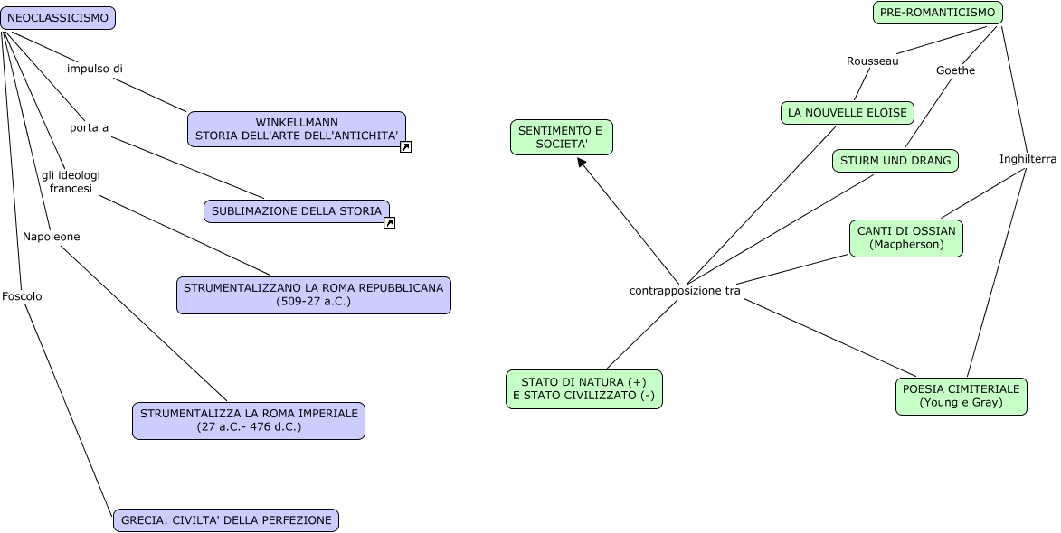 Questa Cmap, creata con IHMC CmapTools, contiene informazioni relative a: NEOCLASSICISMO E PRE-ROMANTICISMO, NEOCLASSICISMO Napoleone STRUMENTALIZZA LA ROMA IMPERIALE (27 a.C.- 476 d.C.), NEOCLASSICISMO Foscolo GRECIA: CIVILTA' DELLA PERFEZIONE, CANTI DI OSSIAN (Macpherson) contrapposizione tra SENTIMENTO E SOCIETA', CANTI DI OSSIAN (Macpherson) contrapposizione tra STATO DI NATURA (+) E STATO CIVILIZZATO (-), PRE-ROMANTICISMO Goethe STURM UND DRANG, STURM UND DRANG contrapposizione tra STATO DI NATURA (+) E STATO CIVILIZZATO (-), POESIA CIMITERIALE (Young e Gray) contrapposizione tra SENTIMENTO E SOCIETA', NEOCLASSICISMO impulso di WINKELLMANN STORIA DELL'ARTE DELL'ANTICHITA', PRE-ROMANTICISMO Rousseau LA NOUVELLE ELOISE, NEOCLASSICISMO gli ideologi francesi STRUMENTALIZZANO LA ROMA REPUBBLICANA (509-27 a.C.), LA NOUVELLE ELOISE contrapposizione tra SENTIMENTO E SOCIETA', LA NOUVELLE ELOISE contrapposizione tra STATO DI NATURA (+) E STATO CIVILIZZATO (-), STURM UND DRANG contrapposizione tra SENTIMENTO E SOCIETA', NEOCLASSICISMO porta a SUBLIMAZIONE DELLA STORIA, PRE-ROMANTICISMO Inghilterra POESIA CIMITERIALE (Young e Gray), PRE-ROMANTICISMO Inghilterra CANTI DI OSSIAN (Macpherson), POESIA CIMITERIALE (Young e Gray) contrapposizione tra STATO DI NATURA (+) E STATO CIVILIZZATO (-)