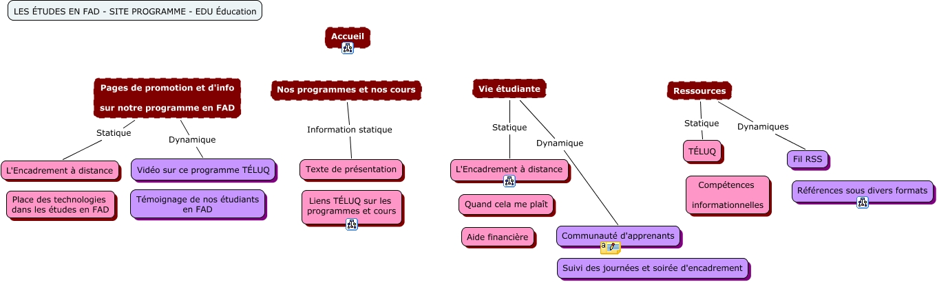 This Concept Map, created with IHMC CmapTools, has information related to: VueD_ensemble, Pages de promotion et d'info sur notre programme en FAD Dynamique Vidéo sur ce programme TÉLUQ, Ressources Dynamiques Fil RSS, Vie étudiante Statique L'Encadrement à distance, Nos programmes et nos cours Information statique Texte de présentation, Pages de promotion et d'info sur notre programme en FAD Statique L'Encadrement à distance, Vie étudiante Dynamique Communauté d'apprenants, Ressources Statique TÉLUQ