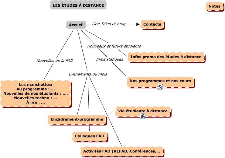 This Concept Map, created with IHMC CmapTools, has information related to: Accueil, Accueil Nouvelles de la FAD Les manchettes: Au programme : ... Nouvelles de nos étudiants : .... Nouvelles techno : ... À lire : ..., Accueil Évènements du mois Activités FAD (REFAD, Conférences,..., Accueil Évènements du mois Encadrement-programme, Accueil Lien Téluq et prog. Contacts, Accueil Nouveaux et futurs étudiants Infos promo des études à distance, Accueil Évènements du mois Colloques FAD, Accueil Infos statiques Nos programmes et nos cours