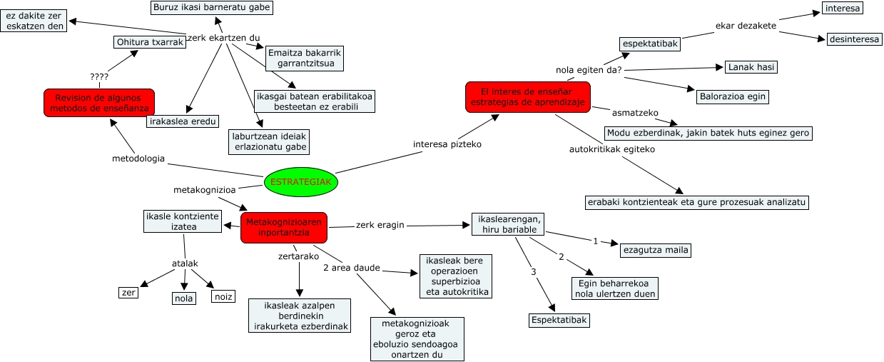 This Concept Map has information related to: Julen Iñurrieta,Ander Agiriano,Mikel Arriolabengoa 2, Metakognizioaren inportantzia 2 area daude metakognizioak geroz eta eboluzio sendoagoa onartzen du, ESTRATEGIAK metakognizioa Metakognizioaren inportantzia, Ohitura txarrak zerk ekartzen du irakaslea eredu, ESTRATEGIAK metodologia Revision de algunos metodos de enseñanza, El interes de enseñar estrategias de aprendizaje autokritikak egiteko erabaki kontzienteak eta gure prozesuak analizatu, Ohitura txarrak zerk ekartzen du ikasgai batean erabilitakoa besteetan ez erabili, Revision de algunos metodos de enseñanza ???? Ohitura txarrak, espektatibak ekar dezakete desinteresa, Metakognizioaren inportantzia ???? ikasle kontziente izatea, Ohitura txarrak zerk ekartzen du ez dakite zer eskatzen den