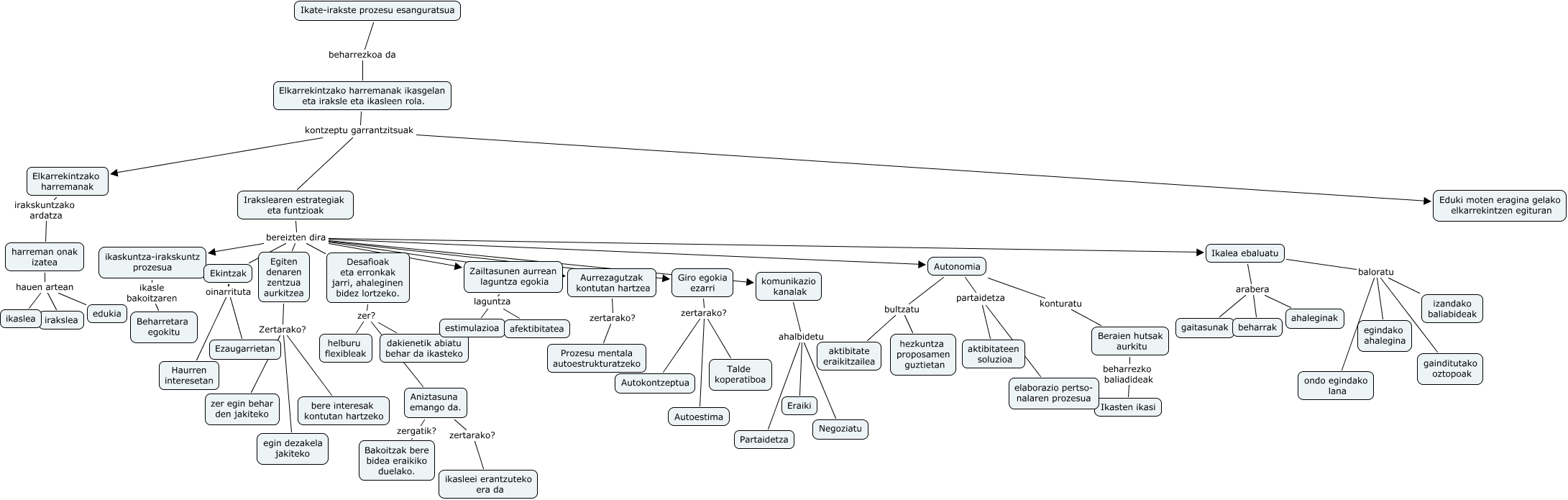 This Concept Map has information related to: T 3.2, Irakslearen estrategiak eta funtzioak bereizten dira Desafioak eta erronkak jarri, ahaleginen bidez lortzeko., Autonomia bultzatu aktibitate eraikitzailea, Desafioak eta erronkak jarri, ahaleginen bidez lortzeko. zer? helburu flexibleak, komunikazio kanalak ahalbidetu Eraiki, Ekintzak oinarrituta Ezaugarrietan, harreman onak izatea hauen artean irakslea, Irakslearen estrategiak eta funtzioak bereizten dira komunikazio kanalak, Ikalea ebaluatu arabera gaitasunak, Ekintzak oinarrituta Haurren interesetan, Autonomia partaidetza aktibitateen soluzioa