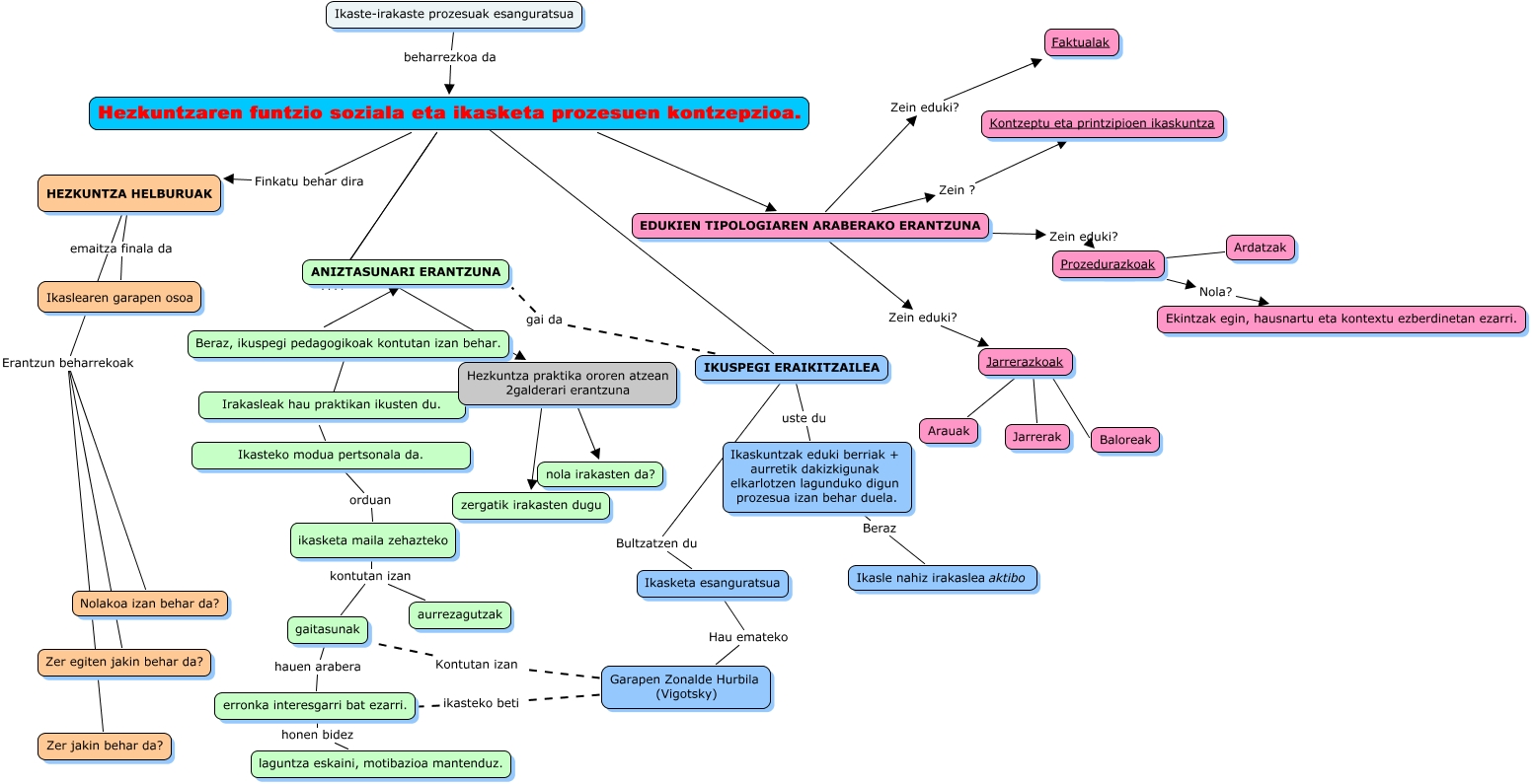 Este Cmap, tiene información relacionada con: t 3.2 hezkuntzaren funtzio soziala etra ikasketa prozesuen kontzepzioa, EDUKIEN TIPOLOGIAREN ARABERAKO ERANTZUNA Zein eduki? Jarrerazkoak, ikasketa maila zehazteko kontutan izan aurrezagutzak, HEZKUNTZA HELBURUAK Erantzun beharrekoak Zer jakin behar da?, ANIZTASUNARI ERANTZUNA ???? Hezkuntza praktika ororen atzean 2galderari erantzuna, Hezkuntzaren funtzio soziala eta ikasketa prozesuen kontzepzioa. Finkatu behar dira HEZKUNTZA HELBURUAK, erronka interesgarri bat ezarri. honen bidez laguntza eskaini, motibazioa mantenduz., EDUKIEN TIPOLOGIAREN ARABERAKO ERANTZUNA Zein eduki? Faktualak, Garapen Zonalde Hurbila (Vigotsky) Kontutan izan gaitasunak, Beraz, ikuspegi pedagogikoak kontutan izan behar. ???? Irakasleak hau praktikan ikusten du., Ikasketa esanguratsua Hau emateko Garapen Zonalde Hurbila (Vigotsky), Ikaste-irakaste prozesuak esanguratsua beharrezkoa da Hezkuntzaren funtzio soziala eta ikasketa prozesuen kontzepzioa., Ardatzak ???? Prozedurazkoak, Prozedurazkoak Nola? Ekintzak egin, hausnartu eta kontextu ezberdinetan ezarri., Garapen Zonalde Hurbila (Vigotsky) ikasteko beti erronka interesgarri bat ezarri., Hezkuntza praktika ororen atzean 2galderari erantzuna ???? zergatik irakasten dugu, Jarrerazkoak ???? Jarrerak, Irakasleak hau praktikan ikusten du. ???? Ikasteko modua pertsonala da., HEZKUNTZA HELBURUAK Erantzun beharrekoak Nolakoa izan behar da?, IKUSPEGI ERAIKITZAILEA gai da ANIZTASUNARI ERANTZUNA, Hezkuntza praktika ororen atzean 2galderari erantzuna ???? nola irakasten da?