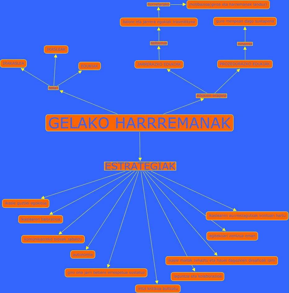 This Concept Map has information related to: T3.7.1, GELAKO HARRREMANAK nola? IKASLEAK, GELAKO HARRREMANAK ESTRATEGIAK iritzi kritikoa bultzatu, GELAKO HARRREMANAK ESTRATEGIAK ikaslearen balorazioa, GELAKO HARRREMANAK ESTRATEGIAK komunikatzeko bideak zabaldu, GELAKO HARRREMANAK ESTRATEGIAK ikasle guztiei egokitua, GELAKO HARRREMANAK edukien eragina JARRERAZKO EDUKIAK, GELAKO HARRREMANAK ESTRATEGIAK giro ona jarri betiere errespetua sustatuz, JARRERAZKO EDUKIAK helburua balore eta jarrera egokiak trasmititzea, GELAKO HARRREMANAK nola? EDUKIAK, GELAKO HARRREMANAK ESTRATEGIAK ikaslearen aurreezagutzak kontuan hartu