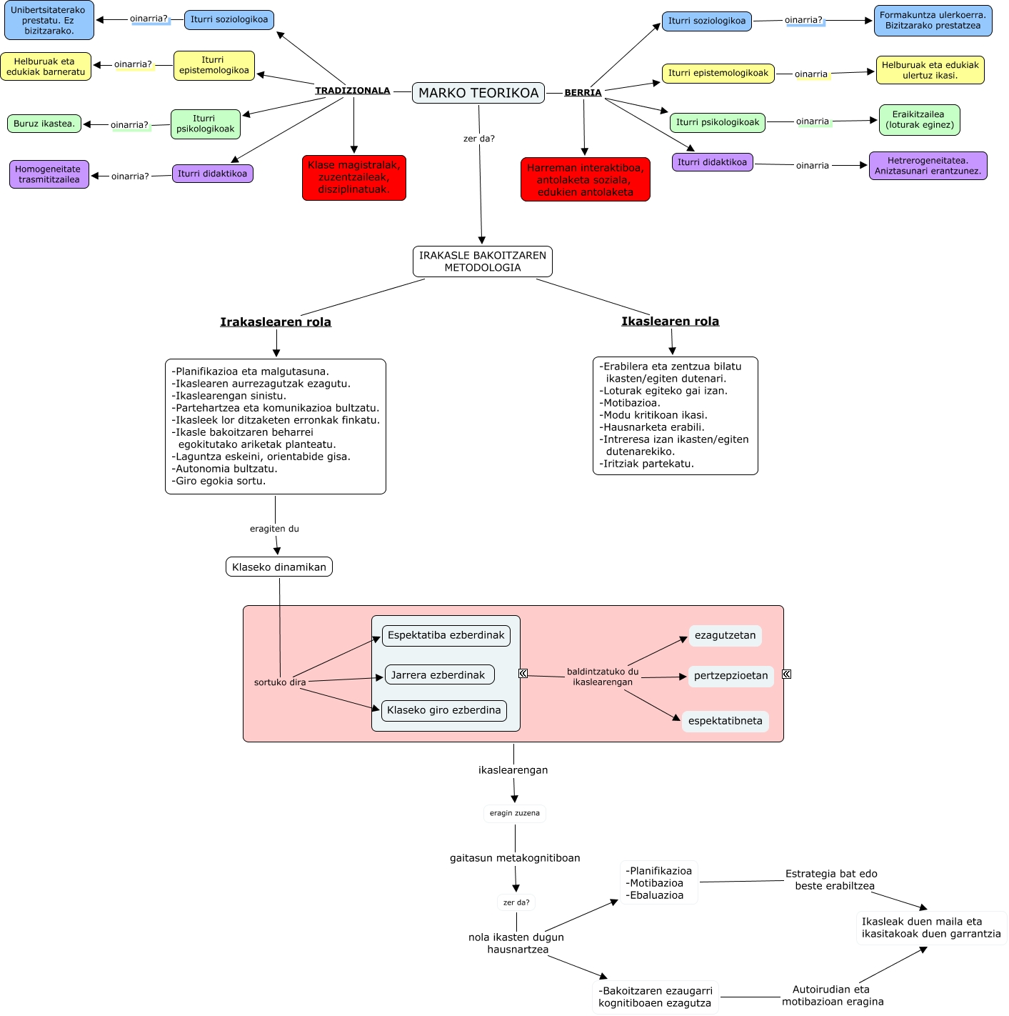 Este Cmap, tiene información relacionada con: Sin Título 1, Iturri epistemologikoak oinarria Helburuak eta edukiak ulertuz ikasi., ???? ikaslearengan eragin zuzena, Iturri didaktikoa oinarria? Homogeneitate trasmititzailea, -Bakoitzaren ezaugarri kognitiboaen ezagutza Autoirudian eta motibazioan eragina Ikasleak duen maila eta ikasitakoak duen garrantzia, ???? baldintzatuko du ikaslearengan ezagutzetan, Klaseko dinamikan sortuko dira Espektatiba ezberdinak, MARKO TEORIKOA TRADIZIONALA Iturri didaktikoa, MARKO TEORIKOA TRADIZIONALA Iturri soziologikoa, IRAKASLE BAKOITZAREN METODOLOGIA Irakaslearen rola -Planifikazioa eta malgutasuna. -Ikaslearen aurrezagutzak ezagutu. -Ikaslearengan sinistu. -Partehartzea eta komunikazioa bultzatu. -Ikasleek lor ditzaketen erronkak finkatu. -Ikasle bakoitzaren beharrei egokitutako ariketak planteatu. -Laguntza eskeini, orientabide gisa. -Autonomia bultzatu. -Giro egokia sortu., MARKO TEORIKOA BERRIA Iturri epistemologikoak, MARKO TEORIKOA BERRIA Iturri didaktikoa, -Planifikazioa eta malgutasuna. -Ikaslearen aurrezagutzak ezagutu. -Ikaslearengan sinistu. -Partehartzea eta komunikazioa bultzatu. -Ikasleek lor ditzaketen erronkak finkatu. -Ikasle bakoitzaren beharrei egokitutako ariketak planteatu. -Laguntza eskeini, orientabide gisa. -Autonomia bultzatu. -Giro egokia sortu. eragiten du Klaseko dinamikan, MARKO TEORIKOA zer da? IRAKASLE BAKOITZAREN METODOLOGIA, zer da? nola ikasten dugun hausnartzea -Bakoitzaren ezaugarri kognitiboaen ezagutza, -Planifikazioa -Motibazioa -Ebaluazioa Estrategia bat edo beste erabiltzea Ikasleak duen maila eta ikasitakoak duen garrantzia, MARKO TEORIKOA BERRIA Harreman interaktiboa, antolaketa soziala, edukien antolaketa, Iturri didaktikoa oinarria Hetrerogeneitatea. Aniztasunari erantzunez., Klaseko dinamikan sortuko dira Jarrera ezberdinak, MARKO TEORIKOA TRADIZIONALA Iturri psikologikoak, ???? baldintzatuko du ikaslearengan espektatibneta