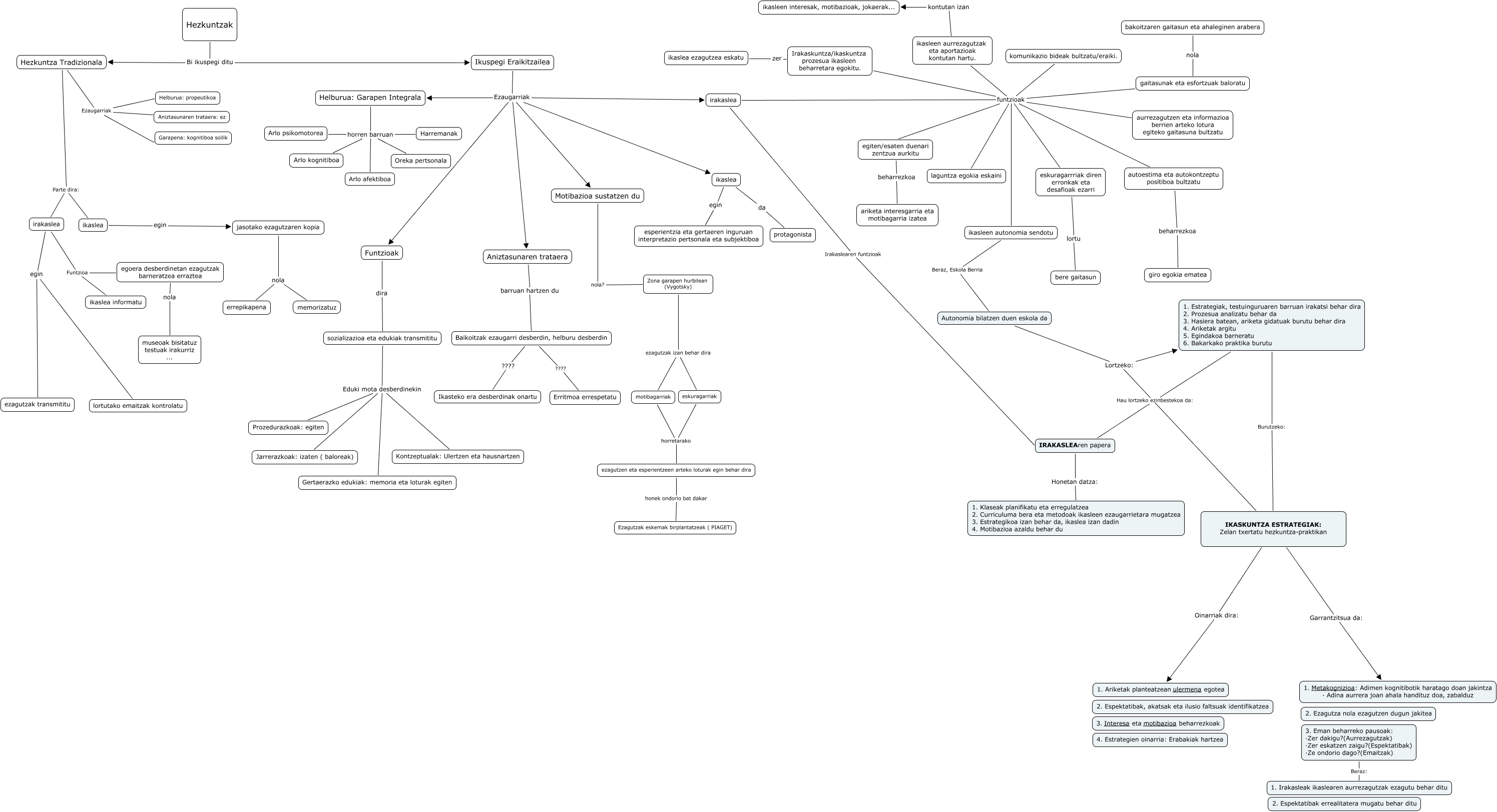 Este Cmap, tiene información relacionada con: Mapa Kontzeptuala (Amaia, Jessica eta Maitane Olatz), egoera desberdinetan ezagutzak barneratzea erraztea nola museoak bisitatuz testuak irakurriz ..., Hezkuntzak Bi ikuspegi ditu Hezkuntza Tradizionala, ikaslea da protagonista, IKASKUNTZA ESTRATEGIAK: Zelan txertatu hezkuntza-praktikan Lortzeko: 1. Estrategiak, testuinguruaren barruan irakatsi behar dira 2. Prozesua analizatu behar da 3. Hasiera batean, ariketa gidatuak burutu behar dira 4. Ariketak argitu 5. Egindakoa barneratu 6. Bakarkako praktika burutu, ikasleen aurrezagutzak eta aportazioak kontutan hartu. kontutan izan ikasleen interesak, motibazioak, jokaerak..., sozializazioa eta edukiak transmititu Eduki mota desberdinekin Prozedurazkoak: egiten, irakaslea funtzioak egiten/esaten duenari zentzua aurkitu, Zona garapen hurbilean (Vygotsky) ezagutzak izan behar dira eskuragarriak, eskuragarrriak diren erronkak eta desafioak ezarri lortu bere gaitasun, irakaslea funtzioak eskuragarrriak diren erronkak eta desafioak ezarri, ikasleen autonomia sendotu Beraz, Eskola Berria Autonomia bilatzen duen eskola da, Irakaskuntza/ikaskuntza prozesua ikasleen beharretara egokitu. zer ikaslea ezagutzea eskatu, Motibazioa sustatzen du nola? Zona garapen hurbilean (Vygotsky), jasotako ezagutzaren kopia nola memorizatuz, Autonomia bilatzen duen eskola da Lortzeko: 1. Estrategiak, testuinguruaren barruan irakatsi behar dira 2. Prozesua analizatu behar da 3. Hasiera batean, ariketa gidatuak burutu behar dira 4. Ariketak argitu 5. Egindakoa barneratu 6. Bakarkako praktika burutu, Baikoitzak ezaugarri desberdin, helburu desberdin ???? Ikasteko era desberdinak onartu, motibagarriak horretarako ezagutzen eta esperientzeen arteko loturak egin behar dira, irakaslea funtzioak autoestima eta autokontzeptu positiboa bultzatu, jasotako ezagutzaren kopia nola errepikapena, Hezkuntza Tradizionala Parte dira: irakaslea