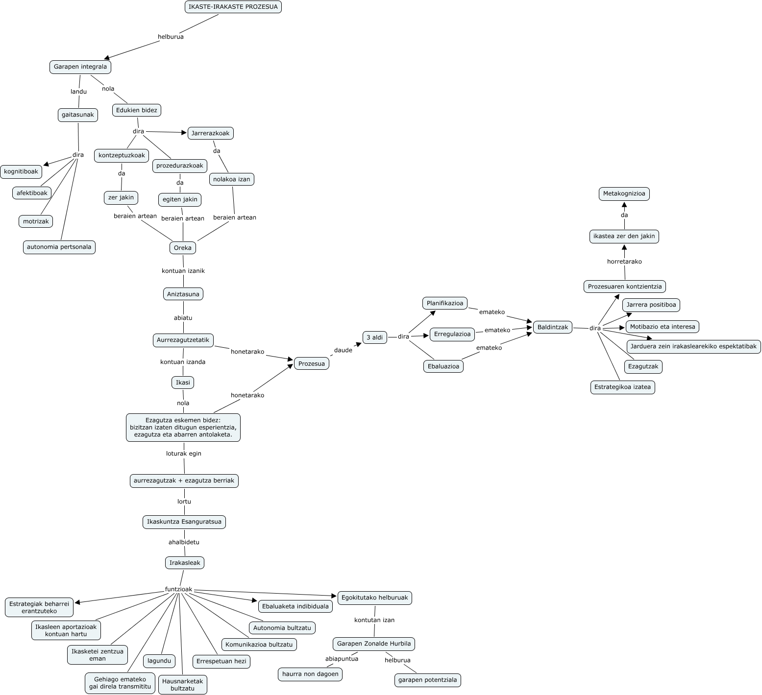 This Concept Map has information related to: Ikaste=irakaste prozesua, Irakasleak funtzioak Komunikazioa bultzatu, gaitasunak dira motrizak, 3 aldi dira Ebaluazioa, Irakasleak funtzioak Estrategiak beharrei erantzuteko, Baldintzak dira Ezagutzak, prozedurazkoak da egiten jakin, Ebaluazioa emateko Baldintzak, Prozesua daude 3 aldi, nolakoa izan beraien artean Oreka, Ezagutza eskemen bidez: bizitzan izaten ditugun esperientzia, ezagutza eta abarren antolaketa. honetarako Prozesua