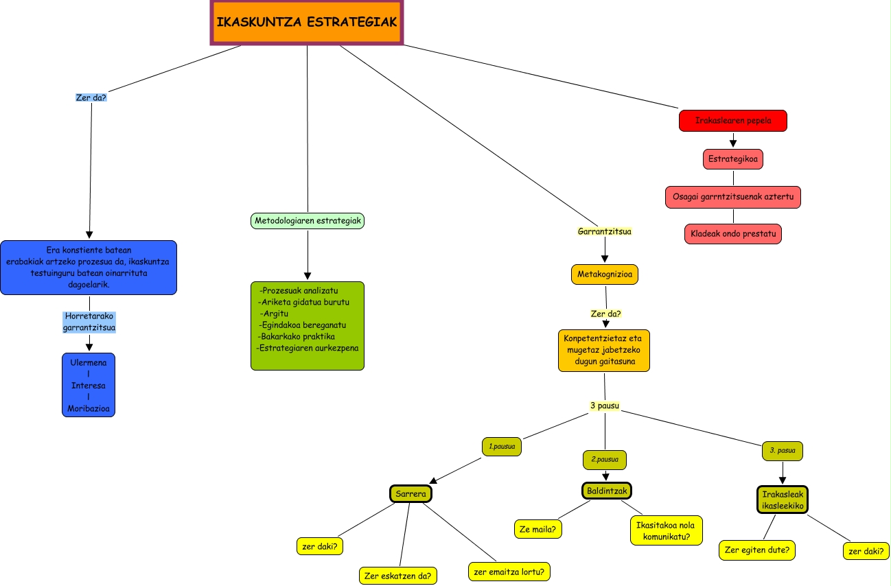 Este Cmap, tiene información relacionada con: Estrategiak(Amets, Oihan eta Jone), 1.pausua Sarrera zer emaitza lortu?, 2.pausua Baldintzak Ze maila?, IKASKUNTZA ESTRATEGIAK Zer da? Era konstiente batean erabakiak artzeko prozesua da, ikaskuntza testuinguru batean oinarrituta dagoelarik., 3. pasua Irakasleak ikasleekiko zer daki?, Estrategikoa Osagai garrntzitsuenak aztertu Kladeak ondo prestatu, Metakognizioa Zer da? Konpetentzietaz eta mugetaz jabetzeko dugun gaitasuna, Era konstiente batean erabakiak artzeko prozesua da, ikaskuntza testuinguru batean oinarrituta dagoelarik. Horretarako garrantzitsua Ulermena l Interesa l Moribazioa, 1.pausua Sarrera zer daki?, 3. pasua Irakasleak ikasleekiko Zer egiten dute?, 1.pausua Sarrera Zer eskatzen da?, Konpetentzietaz eta mugetaz jabetzeko dugun gaitasuna 3 pausu 1.pausua, 2.pausua Baldintzak Ikasitakoa nola komunikatu?, IKASKUNTZA ESTRATEGIAK Garrantzitsua Metakognizioa, IKASKUNTZA ESTRATEGIAK Metodologiaren estrategiak -Prozesuak analizatu -Ariketa gidatua burutu -Argitu -Egindakoa bereganatu -Bakarkako praktika -Estrategiaren aurkezpena, Konpetentzietaz eta mugetaz jabetzeko dugun gaitasuna 3 pausu 3. pasua, IKASKUNTZA ESTRATEGIAK Irakaslearen pepela Estrategikoa, Konpetentzietaz eta mugetaz jabetzeko dugun gaitasuna 3 pausu 2.pausua