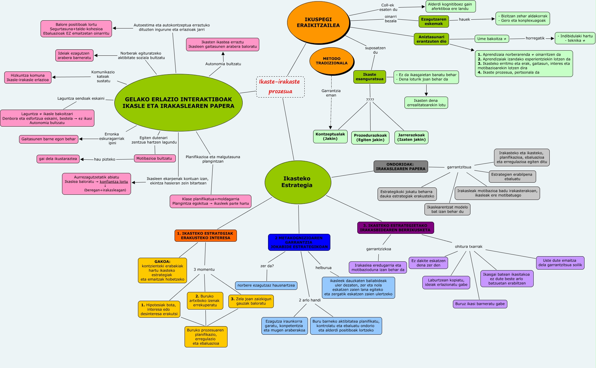 Este Cmap, tiene información relacionada con: 2.2 moduloa, ohitura txarrak Ikasgai batean ikasitakoa ez dute beste arlo batzuetan erabiltzen, Ikasteko Estrategia 1. IKASTEKO ESTRATEGIAK ERAKUSTEKO INTERESA 3 momentu, Ikaste esanguratsua ???? Kontzeptualak (Jakin), ohitura txarrak Laburtzean kopiatu, ideiak erlazionatu gabe, garrantzitsua Estrategikoki jokatu beharra dauka estrategiak erakusteko, GELAKO ERLAZIO INTERAKTIBOAK IKASLE ETA IRAKASLEAREN PAPERA Laguntza sendoak eskaini Laguntza ≠ ikasle bakoitzari Denbora eta esfortzua eskaini, bestela → ez ikasi Autonomia bultzatu, zer da? norbere ezagutzaz hausnartzea, IKUSPEGI ERAIKITZAILEA suposatzen du Ikaste esanguratsua, Ikasteko Estrategia 2 METAKOGNIZIOAREN GARRANTZIA JOKABIDE ESTRATEGIKOAN zer da?, Ikasteko Estrategia 1. IKASTEKO ESTRATEGIAK ERAKUSTEKO INTERESA GAKOA: kontzienteki erabakiak hartu ikasteko estrategiak eta emaitzak hobetzeko, ohitura txarrak Uste dute emaitza dela garrantzitsua soilik, Ikaste esanguratsua - Ez da ikasgaietan banatu behar - Dena loturik joan behar da Ikasten dena errealitatearekin lotu, Ikasteko Estrategia 3. IKASTEKO ESTRATEGIETAKO IRAKASBIDEAREN BERRIKUSKETA garrantzizkoa, garrantzitsua Estrategien erabilpena ebaluatu, ohitura txarrak Ez dakite eskatzen dena zer den, IKUSPEGI ERAIKITZAILEA Ikaste-irakaste prozesua GELAKO ERLAZIO INTERAKTIBOAK IKASLE ETA IRAKASLEAREN PAPERA, GELAKO ERLAZIO INTERAKTIBOAK IKASLE ETA IRAKASLEAREN PAPERA Ikasleen ekarpenak kontuan izan, ekintza hasieran zein bitartean Aurrezagutzetatik abiatu Ikaslea baloratu → konfiantza lortu ↓ (beregan+irakasleagan), IKUSPEGI ERAIKITZAILEA Coll-ek esaten du Alderdi kognitiboez gain aferktiboa ere landu, IKUSPEGI ERAIKITZAILEA Aniztasunari erantzuten dio 1. Aprendizaia norberarenda ≠ oinarritzen da 2. Aprendizaiak izandako esperientziekin lotzen da 3. Ikasteko erritmo eta erak, gaitasun, interes eta motibazioarekin lotzen dira 4. Ikaste prozesua, pertsonala da, IKUSPEGI ERAIKITZAILEA Ikaste-irakaste prozesua Ikasteko Estrategia