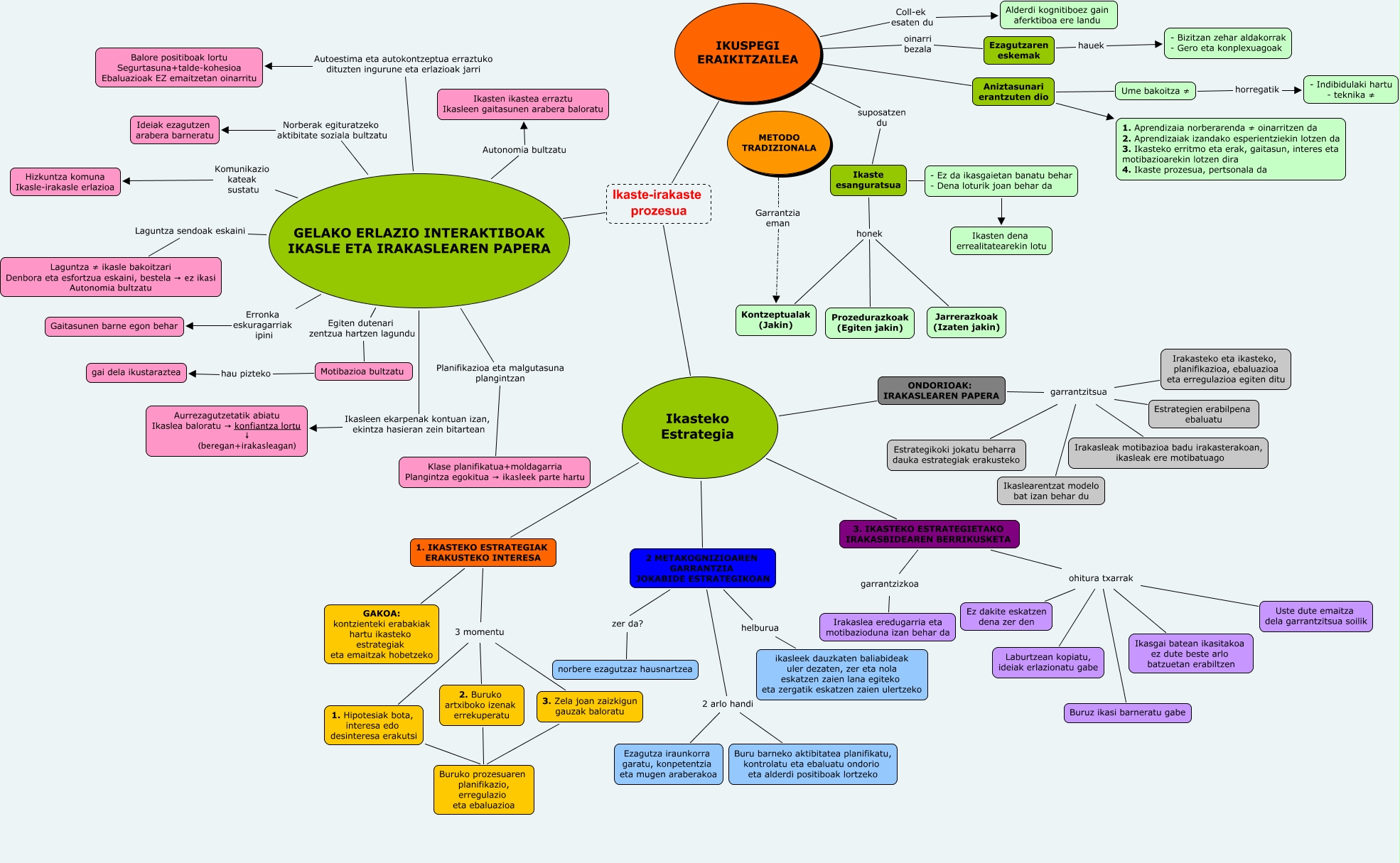 This Concept Map has information related to: Ander Retolaza_Aitziber Soriano_Nora Yugueros, ohitura txarrak Ikasgai batean ikasitakoa ez dute beste arlo batzuetan erabiltzen , Ikasteko Estrategia 1. IKASTEKO ESTRATEGIAK ERAKUSTEKO INTERESA 3 momentu, Ikaste esanguratsua honek Kontzeptualak (Jakin), ohitura txarrak Laburtzean kopiatu, ideiak erlazionatu gabe , garrantzitsua Estrategikoki jokatu beharra dauka estrategiak erakusteko , GELAKO ERLAZIO INTERAKTIBOAK IKASLE ETA IRAKASLEAREN PAPERA Laguntza sendoak eskaini Laguntza ≠ ikasle bakoitzari Denbora eta esfortzua eskaini, bestela → ez ikasi Autonomia bultzatu, zer da? norbere ezagutzaz hausnartzea , IKUSPEGI ERAIKITZAILEA suposatzen du Ikaste esanguratsua, Ikasteko Estrategia 2 METAKOGNIZIOAREN GARRANTZIA JOKABIDE ESTRATEGIKOAN zer da?, Ikasteko Estrategia 1. IKASTEKO ESTRATEGIAK ERAKUSTEKO INTERESA GAKOA: kontzienteki erabakiak hartu ikasteko estrategiak eta emaitzak hobetzeko