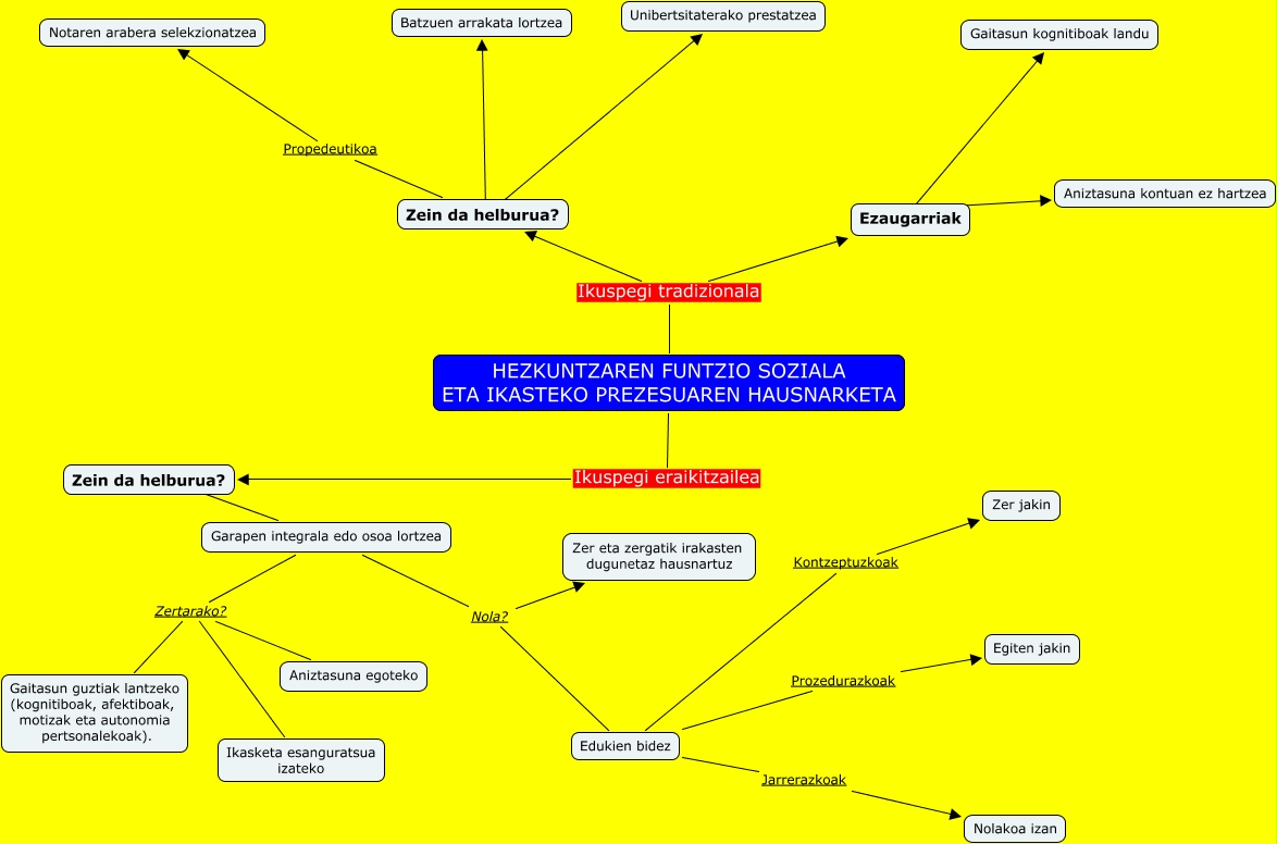 Este Cmap, tiene información relacionada con: t.3.5. (hezkuntzaren funtzio soziala eta ikasteko prozesuaren hausnarketa), Edukien bidez Prozedurazkoak Egiten jakin, Ezaugarriak ???? Gaitasun kognitiboak landu, Edukien bidez Jarrerazkoak Nolakoa izan, Zein da helburua? ???? Batzuen arrakata lortzea, HEZKUNTZAREN FUNTZIO SOZIALA ETA IKASTEKO PREZESUAREN HAUSNARKETA Ikuspegi tradizionala Zein da helburua?, Zein da helburua? ???? Garapen integrala edo osoa lortzea, HEZKUNTZAREN FUNTZIO SOZIALA ETA IKASTEKO PREZESUAREN HAUSNARKETA Ikuspegi tradizionala Ezaugarriak, Zein da helburua? ???? Unibertsitaterako prestatzea, HEZKUNTZAREN FUNTZIO SOZIALA ETA IKASTEKO PREZESUAREN HAUSNARKETA Ikuspegi eraikitzailea Zein da helburua?, Garapen integrala edo osoa lortzea Zertarako? Gaitasun guztiak lantzeko (kognitiboak, afektiboak, motizak eta autonomia pertsonalekoak)., Garapen integrala edo osoa lortzea Zertarako? Aniztasuna egoteko, Garapen integrala edo osoa lortzea Nola? Edukien bidez, Zein da helburua? Propedeutikoa Notaren arabera selekzionatzea, Garapen integrala edo osoa lortzea Nola? Zer eta zergatik irakasten dugunetaz hausnartuz, Garapen integrala edo osoa lortzea Zertarako? Ikasketa esanguratsua izateko, Ezaugarriak ???? Aniztasuna kontuan ez hartzea, Edukien bidez Kontzeptuzkoak Zer jakin