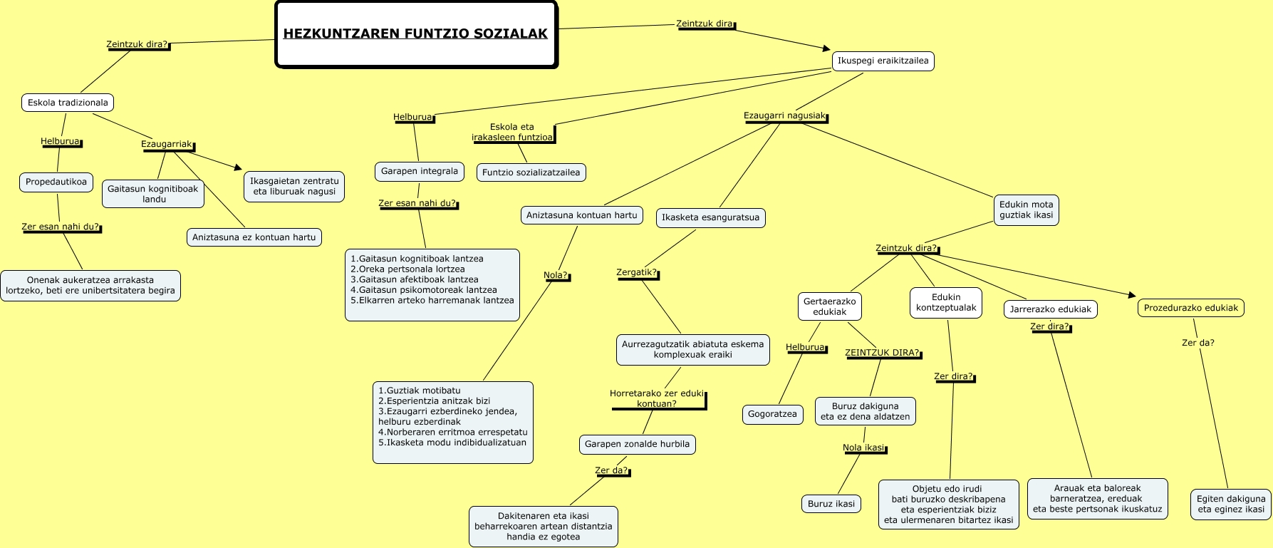 Este Cmap, tiene información relacionada con: hezkuntzaren funtzio sozialak(aritz, arkaitz, axier), Ikasketa esanguratsua Zergatik? Aurrezagutzatik abiatuta eskema komplexuak eraiki, Eskola tradizionala Ezaugarriak Ikasgaietan zentratu eta liburuak nagusi, Prozedurazko edukiak Zer da? Egiten dakiguna eta eginez ikasi, HEZKUNTZAREN FUNTZIO SOZIALAK Zeintzuk dira? Eskola tradizionala, Ikuspegi eraikitzailea Ezaugarri nagusiak Aniztasuna kontuan hartu, Edukin mota guztiak ikasi Zeintzuk dira? Gertaerazko edukiak, Ikuspegi eraikitzailea Ezaugarri nagusiak Edukin mota guztiak ikasi, Edukin mota guztiak ikasi Zeintzuk dira? Jarrerazko edukiak, Edukin mota guztiak ikasi Zeintzuk dira? Edukin kontzeptualak, Jarrerazko edukiak Zer dira? Arauak eta baloreak barneratzea, ereduak eta beste pertsonak ikuskatuz, HEZKUNTZAREN FUNTZIO SOZIALAK Zeintzuk dira Ikuspegi eraikitzailea, Garapen integrala Zer esan nahi du? 1.Gaitasun kognitiboak lantzea 2.Oreka pertsonala lortzea 3.Gaitasun afektiboak lantzea 4.Gaitasun psikomotoreak lantzea 5.Elkarren arteko harremanak lantzea, Ikuspegi eraikitzailea Eskola eta irakasleen funtzioa Funtzio sozializatzailea, Edukin mota guztiak ikasi Zeintzuk dira? Prozedurazko edukiak, Edukin kontzeptualak Zer dira? Objetu edo irudi bati buruzko deskribapena eta esperientziak biziz eta ulermenaren bitartez ikasi, Propedautikoa Zer esan nahi du? Onenak aukeratzea arrakasta lortzeko, beti ere unibertsitatera begira, Gertaerazko edukiak ZEINTZUK DIRA? Buruz dakiguna eta ez dena aldatzen, Eskola tradizionala Ezaugarriak Aniztasuna ez kontuan hartu, Aniztasuna kontuan hartu Nola? 1.Guztiak motibatu 2.Esperientzia anitzak bizi 3.Ezaugarri ezberdineko jendea, helburu ezberdinak 4.Norberaren erritmoa errespetatu 5.Ikasketa modu indibidualizatuan, Garapen zonalde hurbila Zer da? Dakitenaren eta ikasi beharrekoaren artean distantzia handia ez egotea