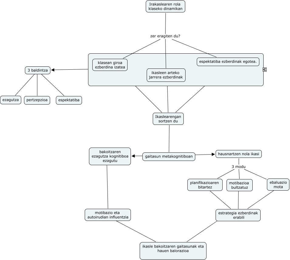 This Concept Map has information related to: Iban, andoni eta Josu, estrategia ezberdinak erabili ???? ebaluazio mota, Ikaslearengan sortzen du ???? gaitasun metakognitiboan, hausnartzen nola ikasi 3 modu planifikazioaren bitartez, planifikazioaren bitartez ???? estrategia ezberdinak erabili, 3 baldintza ???? ezagutza, 3 baldintza ???? pertzepzioa, motibazio eta autoirudian influentzia ???? ikasle bakoitzaren gaitasunak eta hauen balorazioa, Irakaslearen rola klaseko dinamikan zer eragiten du? espektatiba ezberdinak egotea., estrategia ezberdinak erabili ???? motibazioa bultzatuz, Ikaslearengan sortzen du ???? espektatiba ezberdinak egotea.