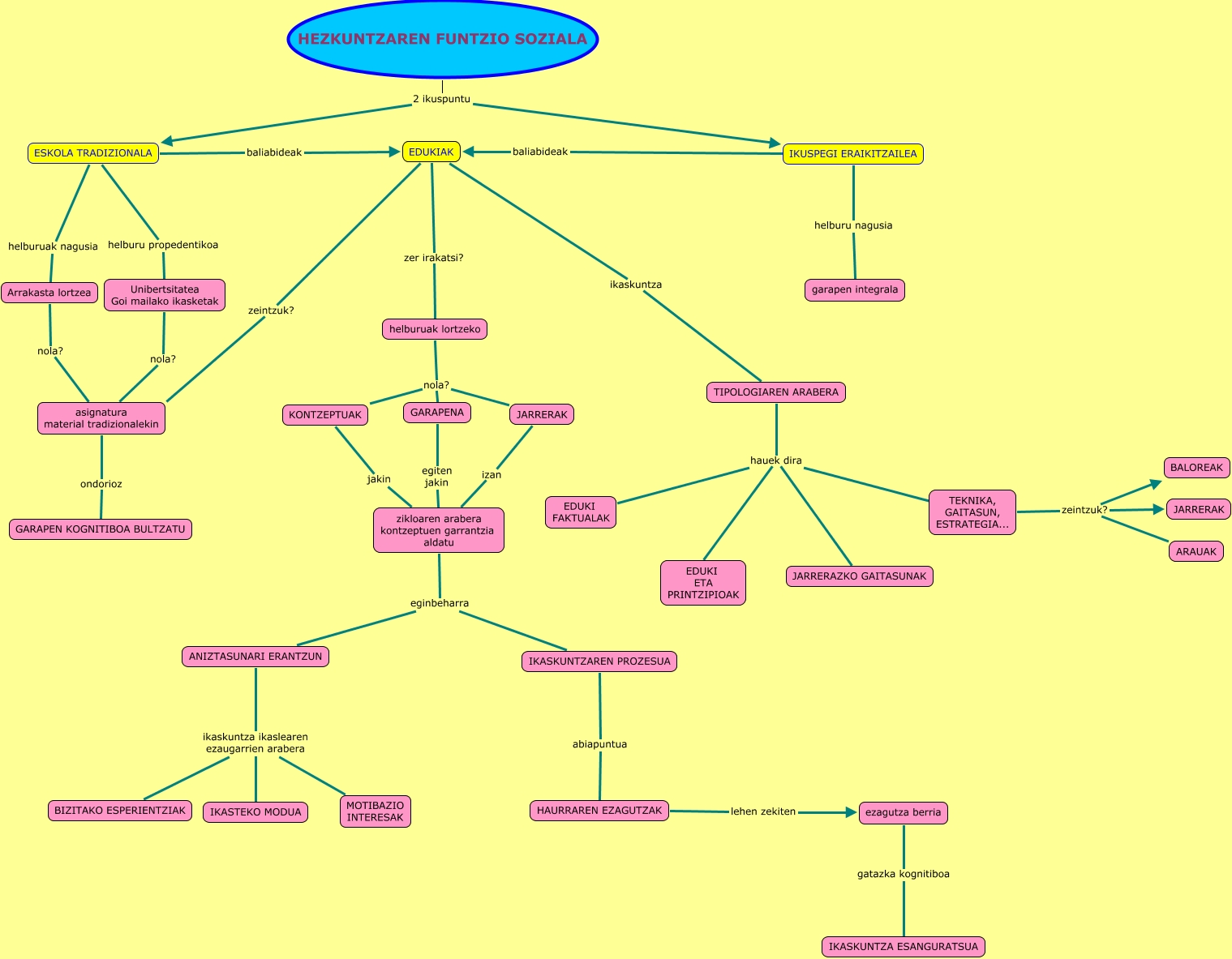Este Cmap, tiene información relacionada con: Maria, Ion, Lierni (hezkuntzaren funtzio soziala), HAURRAREN EZAGUTZAK lehen zekiten ezagutza berria, KONTZEPTUAK jakin zikloaren arabera kontzeptuen garrantzia aldatu, Arrakasta lortzea nola? asignatura material tradizionalekin, EDUKIAK ikaskuntza TIPOLOGIAREN ARABERA, TEKNIKA, GAITASUN, ESTRATEGIA... zeintzuk? BALOREAK, TIPOLOGIAREN ARABERA hauek dira TEKNIKA, GAITASUN, ESTRATEGIA..., IKASKUNTZAREN PROZESUA abiapuntua HAURRAREN EZAGUTZAK, TIPOLOGIAREN ARABERA hauek dira JARRERAZKO GAITASUNAK, asignatura material tradizionalekin ondorioz GARAPEN KOGNITIBOA BULTZATU, ESKOLA TRADIZIONALA helburuak nagusia Arrakasta lortzea, ANIZTASUNARI ERANTZUN ikaskuntza ikaslearen ezaugarrien arabera MOTIBAZIO INTERESAK, IKUSPEGI ERAIKITZAILEA baliabideak EDUKIAK, ezagutza berria gatazka kognitiboa IKASKUNTZA ESANGURATSUA, ANIZTASUNARI ERANTZUN ikaskuntza ikaslearen ezaugarrien arabera IKASTEKO MODUA, TIPOLOGIAREN ARABERA hauek dira EDUKI FAKTUALAK, EDUKIAK zer irakatsi? helburuak lortzeko, GARAPENA egiten jakin zikloaren arabera kontzeptuen garrantzia aldatu, EDUKIAK zeintzuk? asignatura material tradizionalekin, TIPOLOGIAREN ARABERA hauek dira EDUKI ETA PRINTZIPIOAK, helburuak lortzeko nola? GARAPENA