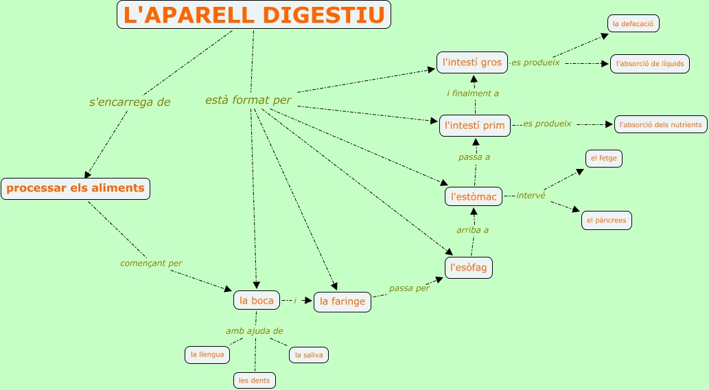 Este Cmap, tiene información relacionada con: aparell digestiu, la boca i la faringe, L'APARELL DIGESTIU està format per la boca, l'intestí prim i finalment a l'intestí gros, L'APARELL DIGESTIU està format per l'intestí gros, L'APARELL DIGESTIU està format per l'intestí prim, la boca amb ajuda de les dents, processar els aliments començant per la boca, l'intestí prim es produeix l'absorció dels nutrients, L'APARELL DIGESTIU s'encarrega de ????, la boca amb ajuda de la llengua, l'intestí gros es produeix l'absorció de líquids, L'APARELL DIGESTIU està format per l'estòmac, L'APARELL DIGESTIU està format per la faringe, l'estòmac passa a l'intestí prim, l'estòmac intervé el pàncrees, la boca amb ajuda de la saliva, l'estòmac intervé el fetge, l'intestí gros es produeix la defecació, la faringe passa per l'esòfag, L'APARELL DIGESTIU està format per l'esòfag