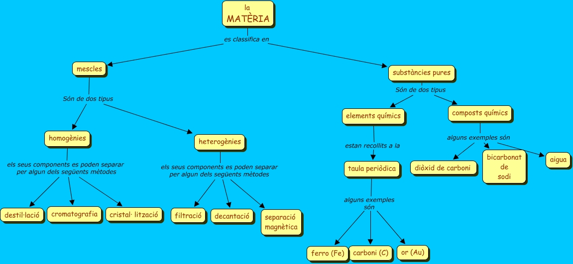 MATÈRIA </mtext> </mrow> </math> es classifica en mescles, homogènies els seus components es poden separar per algun dels següents mètodes cristal· lització, heterogènies els seus components es poden separar per algun dels següents mètodes separació magnètica, taula periòdica alguns exemples són or (Au), mescles Són de dos tipus homogènies, mescles Són de dos tipus heterogènies, heterogènies els seus components es poden separar per algun dels següents mètodes filtració, <math xmlns="http://www.w3.org/1998/Math/MathML"> <mrow> <mtext> la
