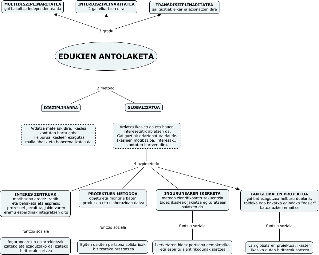 This Concept Map has information related to: 2. gaxe, EDUKIEN ANTOLAKETA 3 gradu INTERDISZIPLINARITATEA 2 gai elkartzen dira, INTERES ZENTRUAK motibazioa ardatz izanik eta behaketa eta espresio prozesuei jarraituz, jakintzaren eremu ezberdinak integratzen ditu funtzio soziala Ingurunearekin elkarrekintzak izateko eta ezagutzako gai izateko hiritarrak sortzea, EDUKIEN ANTOLAKETA 2 metodo DISZIPLINARRA, GLOBALIZATUA ???? Ardatza ikaslea da eta hauen interesetatik abiatzen da. Gai guztiak erlazionatuta daude. Ikasleen motibazioa, interesak... kontutan hartzen dira., EDUKIEN ANTOLAKETA 2 metodo GLOBALIZATUA, INGURUNEAREN IKERKETA metodo zientifikoaren sekuentzia bidez ikasleek jakintza egituratzean saiatzen da. funtzio soziala Ikerketaren bidez pertsona demokratiko eta espiritu zientifikodunak sortzea, EDUKIEN ANTOLAKETA 3 gradu TRANSDISZIPLINARITATEA gai guztiak elkar erlazionatzen dira, EDUKIEN ANTOLAKETA 3 gradu MULTIDISZIPLINARITATEA gai bakoitza independentea da, LAN GLOBALEN PROIEKTUA gai bat ezagutzea helburu duelarik, taldeka edo bakarka egindako "dosier" batda azken emaitza funtzio soziala Lan globalaren proiektua: ikasten ikasiko duten hiritarrak sortzea, Ardatza ikaslea da eta hauen interesetatik abiatzen da. Gai guztiak erlazionatuta daude. Ikasleen motibazioa, interesak... kontutan hartzen dira. 4 azpimetodo INTERES ZENTRUAK motibazioa ardatz izanik eta behaketa eta espresio prozesuei jarraituz, jakintzaren eremu ezberdinak integratzen ditu