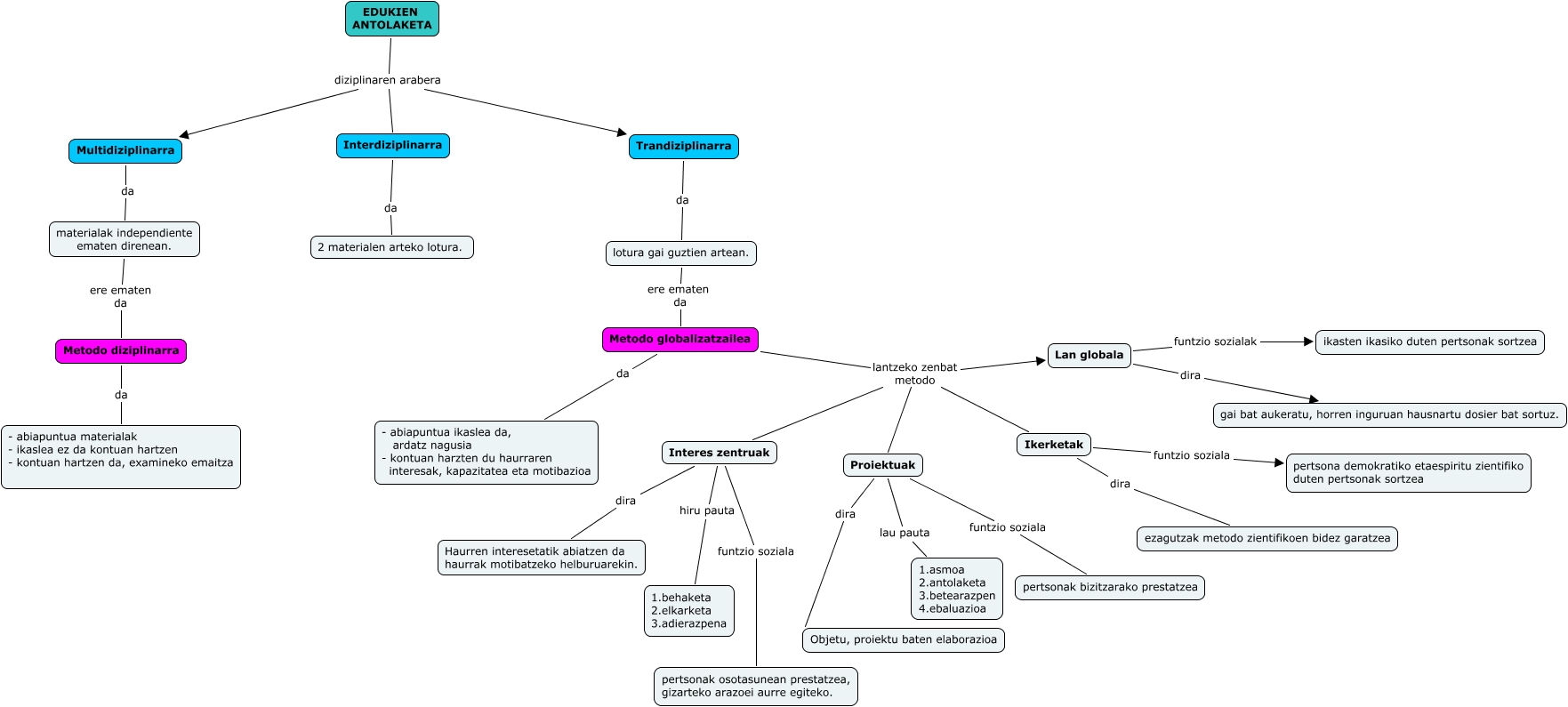 This Concept Map has information related to: meritxel. maialen eta nerea, Metodo diziplinarra da - abiapuntua materialak - ikaslea ez da kontuan hartzen - kontuan hartzen da, examineko emaitza, Trandiziplinarra da lotura gai guztien artean., Metodo globalizatzailea lantzeko zenbat metodo Interes zentruak, Lan globala dira gai bat aukeratu, horren inguruan hausnartu dosier bat sortuz., Interes zentruak hiru pauta 1.behaketa 2.elkarketa 3.adierazpena, Proiektuak lau pauta 1.asmoa 2.antolaketa 3.betearazpen 4.ebaluazioa, Lan globala funtzio sozialak ikasten ikasiko duten pertsonak sortzea, Metodo globalizatzailea da - abiapuntua ikaslea da, ardatz nagusia - kontuan harzten du haurraren interesak, kapazitatea eta motibazioa, EDUKIEN ANTOLAKETA diziplinaren arabera Trandiziplinarra, Multidiziplinarra da materialak independiente ematen direnean.