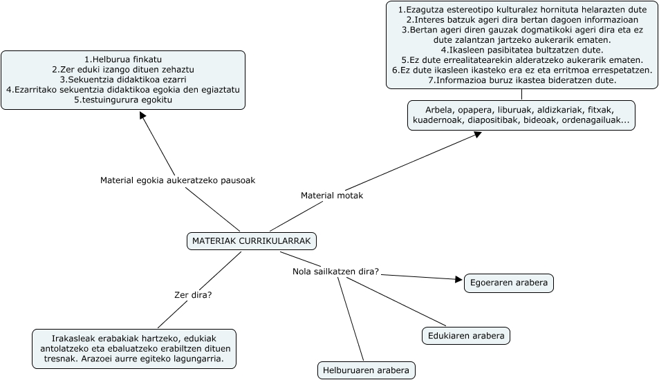 This Concept Map has information related to: 2. gaxe (nerea-7), MATERIAK CURRIKULARRAK Nola sailkatzen dira? Edukiaren arabera, MATERIAK CURRIKULARRAK Material motak Arbela, opapera, liburuak, aldizkariak, fitxak, kuadernoak, diapositibak, bideoak, ordenagailuak..., MATERIAK CURRIKULARRAK Material egokia aukeratzeko pausoak 1.Helburua finkatu 2.Zer eduki izango dituen zehaztu 3.Sekuentzia didaktikoa ezarri 4.Ezarritako sekuentzia didaktikoa egokia den egiaztatu 5.testuingurura egokitu, Arbela, opapera, liburuak, aldizkariak, fitxak, kuadernoak, diapositibak, bideoak, ordenagailuak... Liburuei kritika 1.Ezagutza estereotipo kulturalez hornituta helarazten dute 2.Interes batzuk ageri dira bertan dagoen informazioan 3.Bertan ageri diren gauzak dogmatikoki ageri dira eta ez dute zalantzan jartzeko aukerarik ematen. 4.Ikasleen pasibitatea bultzatzen dute. 5.Ez dute errealitatearekin alderatzeko aukerarik ematen. 6.Ez dute ikasleen ikasteko era ez eta erritmoa errespetatzen. 7.Informazioa buruz ikastea bideratzen dute., MATERIAK CURRIKULARRAK Zer dira? Irakasleak erabakiak hartzeko, edukiak antolatzeko eta ebaluatzeko erabiltzen dituen tresnak. Arazoei aurre egiteko lagungarria., MATERIAK CURRIKULARRAK Nola sailkatzen dira? Helburuaren arabera, MATERIAK CURRIKULARRAK Nola sailkatzen dira? Egoeraren arabera